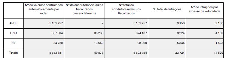 Quanto às ações de fiscalização em Portugal, o número de condutores fiscalizados, presencialmente, foi de 593.854. Por radar, foram controlados 56.803.487 veículos.