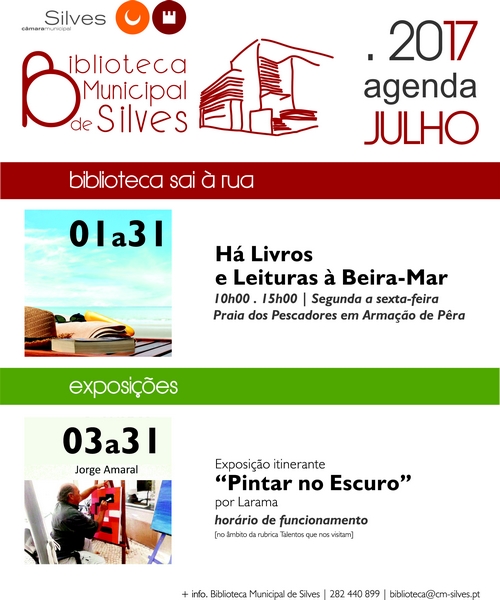 “Há Livros e Leituras à Beira-Mar”, é assim que se designa a biblioteca que está em Armação de Pêra durante todo o mês de julho, entre as 10h00 e as 15h00, de segunda a sexta-feira, na Praia dos Pescadores. Mais novos e mais velhos poderão encontrar livros para ler, naturalmente e participar em algumas atividades lúdico-pedagógicas, aproveitando o tempo de férias para descobrir novos livros e autores.