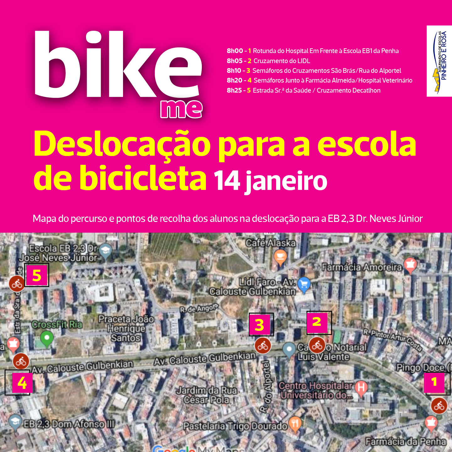 No âmbito do projeto BIKE Me, os alunos da escola secundária Pinheiro e Rosa já utilizam a bicicleta como meio de transporte. Vamos iniciar no dia 14 terça-feira com os mais jovens, a deslocação para a escola de bicicleta, com o apoio da PSP que garante a segurança do grupo a partir dos 5 pontos de reunião de alunos ciclistas pela cidade.
