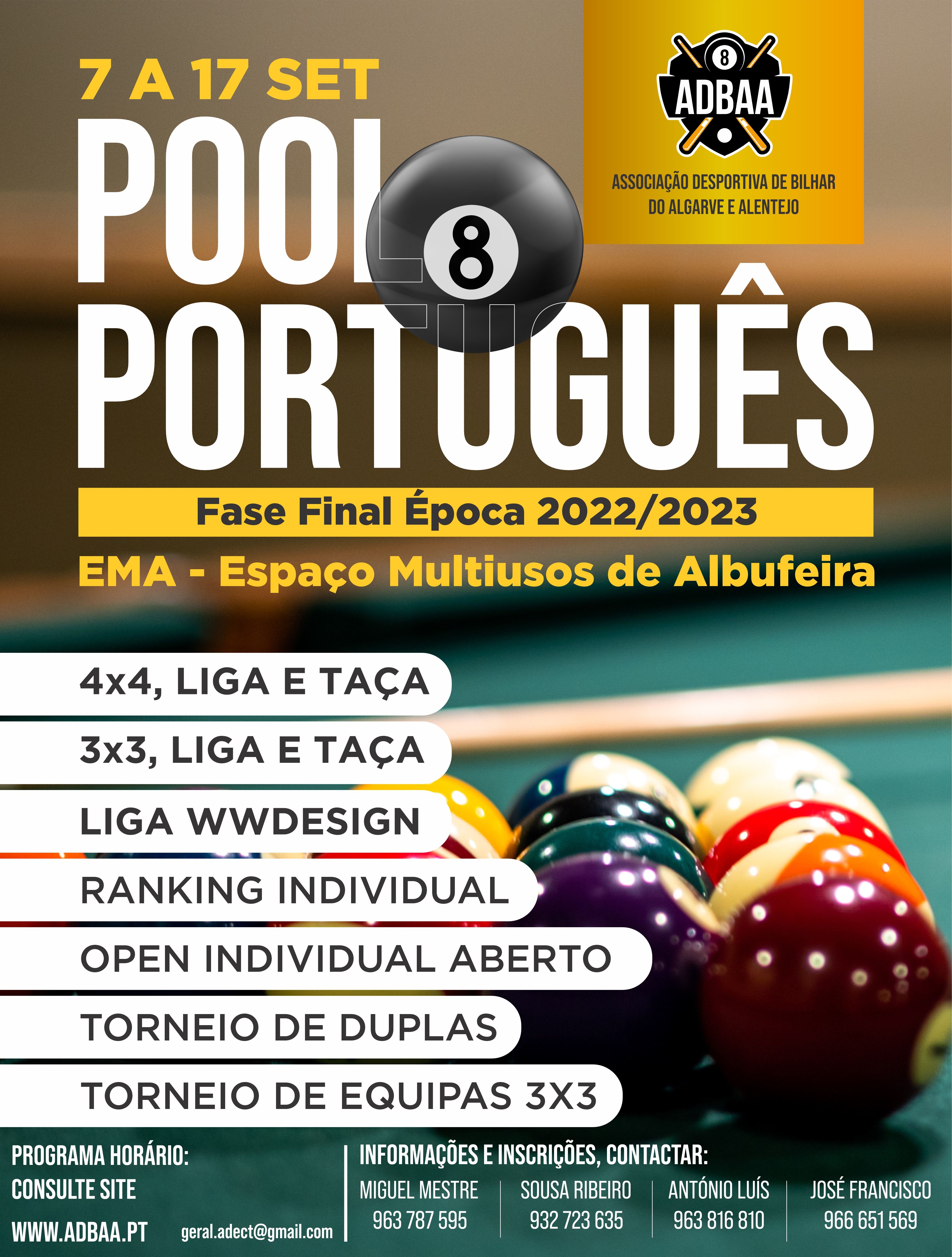De 7 a 17 de setembro, o Espaço Multiusos de Albufeira acolhe a Fase Final das Competições de Pool Português relativa à época 2022/2023. As competições, homologadas pela Federação Portuguesa de Bilhar, iniciaram-se no ano passado, no mês de outubro, e envolveram mais de 40 equipas e mais de 300 jogadores em provas realizadas por todo o Algarve e litoral alentejano na chamada variante de “Bola 8”, distribuídas por quatro séries, denominadas de Sotavento, Centro (Albufeira – Silves); Barlavento e Costa Vicentina.