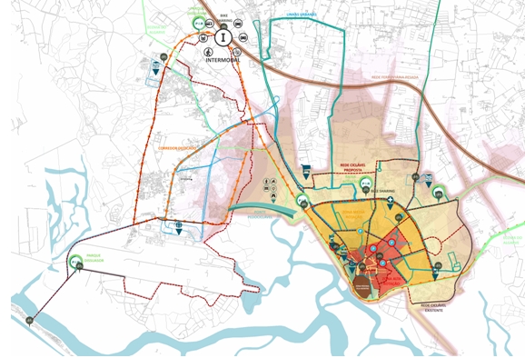 No ponto de confluência entre os canais dos diversos modos de transporte, é proposta a criação de uma interface multimodal de nível regional, apoiada pelo terminal dos transportes urbanos no centro da cidade, que possibilitará conectar a região entre si mas também com o resto do país.