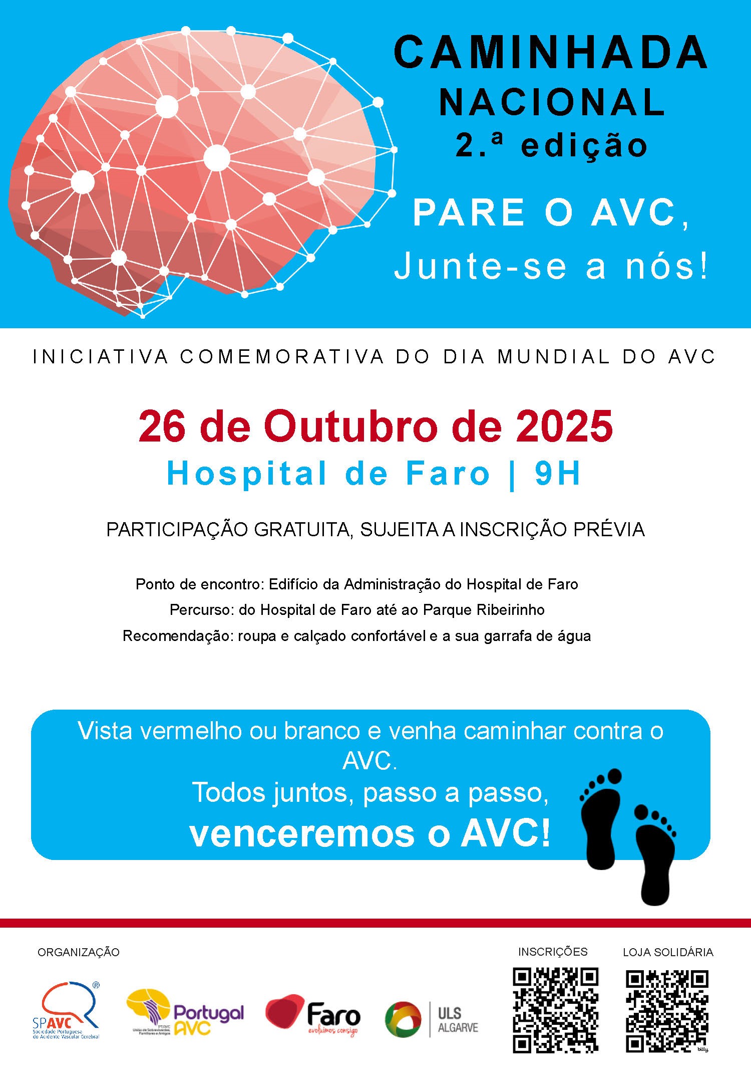 A caminhada, aberta à população, tem lugar no dia 26 de outubro, logo pelas 09h00, com início junto ao edifício da administração do Hospital de Faro. A iniciativa conta com o apoio da Câmara Municipal de Faro e da Sociedade Portuguesa de Acidente Vascular Cerebral.