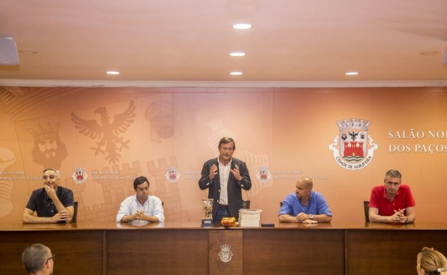 “É uma alegria para Albufeira estar representada por atletas com esta qualidade, que elevam o nome do concelho ao atingirem resultados excecionais que nos orgulham a todos”, salientou Carlos Silva e Sousa, presidente da Câmara Municipal de Albufeira, durante a receção que realizou ao Imortal Basket Club, no Salão Nobre dos Paços do Concelho, no passado dia 16 de junho. O autarca fez questão de receber a equipa de atletas, treinadores e dirigentes, que no passado dia 10 de junho conquistaram o título de Campeões Nacionais da 1ª Divisão masculina ao derrotar a Académica de Coimbra, no Barreiro, por 73-64. “Terminámos a época com a cereja no topo do bolo ao vencermos o jogo que nos deu o título nacional, o passaporte para a subida de Divisão e o apuramento para a Pró-liga, que era o nosso objetivo”, referiu Luís Modesto, treinador da equipa sénior do Imortal Basket Club, acrescentando que “Albufeira e o basquetebol merecem ter uma equipa de seniores na Liga”. Recorde-se que o Basquetebol sempre foi por excelência a modalidade mais praticada no concelho de Albufeira, iniciada e desenvolvida no Imortal Desportivo Clube, fundado em 1920. Em 2011 nasce o Imortal Basket Club, fruto da paixão comum pela modalidade de atuais jogadores, técnicos, pais e dirigentes, que autonomizaram a secção de basquetebol com o objetivo de desenvolver a modalidade e apostar na formação de jovens atletas. “Temos investido bastante na formação dos nossos atletas e pretendemos que o Imortal Basket Club continue a crescer e a ser uma referência na formação destes jovens, quer a nível regional quer nacional, para que possamos ter equipas em todos os escalões até aos seniores a conquistarem títulos”, destacou Jorge Guerreiro, presidente da direção do clube. O dirigente agradeceu o apoio do Município de Albufeira, “sem o qual seria impossível alcançar estes resultados”. Refira-se que a Câmara Municipal de Albufeira apoia o Imortal Basket Club através de um Contrato Programa de Desenvolvimento Desportivo, que para além da comparticipação financeira contempla ainda apoio logístico nas atividades, cedência de infraestruturas desportivas e disponibilização de transporte. “Somos um Município que aposta fortemente no desporto e na juventude, por isso apoiamos os clubes e associações que se dedicam à formação das camadas juvenis e tornam os nossos meninos e meninas em grandes atletas, mas também grandes homens e mulheres com valores”, frisou Carlos Silva e Sousa. O Imortal Basket Club tem desenvolvido um trabalho de mérito na formação, premiado com a distinção de Escolas de Minibasquete de Qualidade. Movimenta por época cerca de 200 atletas nos diversos escalões (Mini 8, Mini 10, Mini 12, Sub. 14, Sub. 16, Sub. 18, Sub. 19 e Seniores) todos eles com títulos de Campeões Regionais. As equipas de formação já foram vencedoras de 3 Taças Nacionais e o escalão Sénior já obteve o título de Campeão Nacional da 3ª Divisão, 2ª Divisão, 1º Divisão e também da CNB1 e CNB2. O Clube conta atualmente com 367 associados, 430 praticantes e outros 430 atletas federados, não só no Basquetebol, mas também na Ginástica Acrobática, Ténis, Tae kwon Do e Escola de Palco.