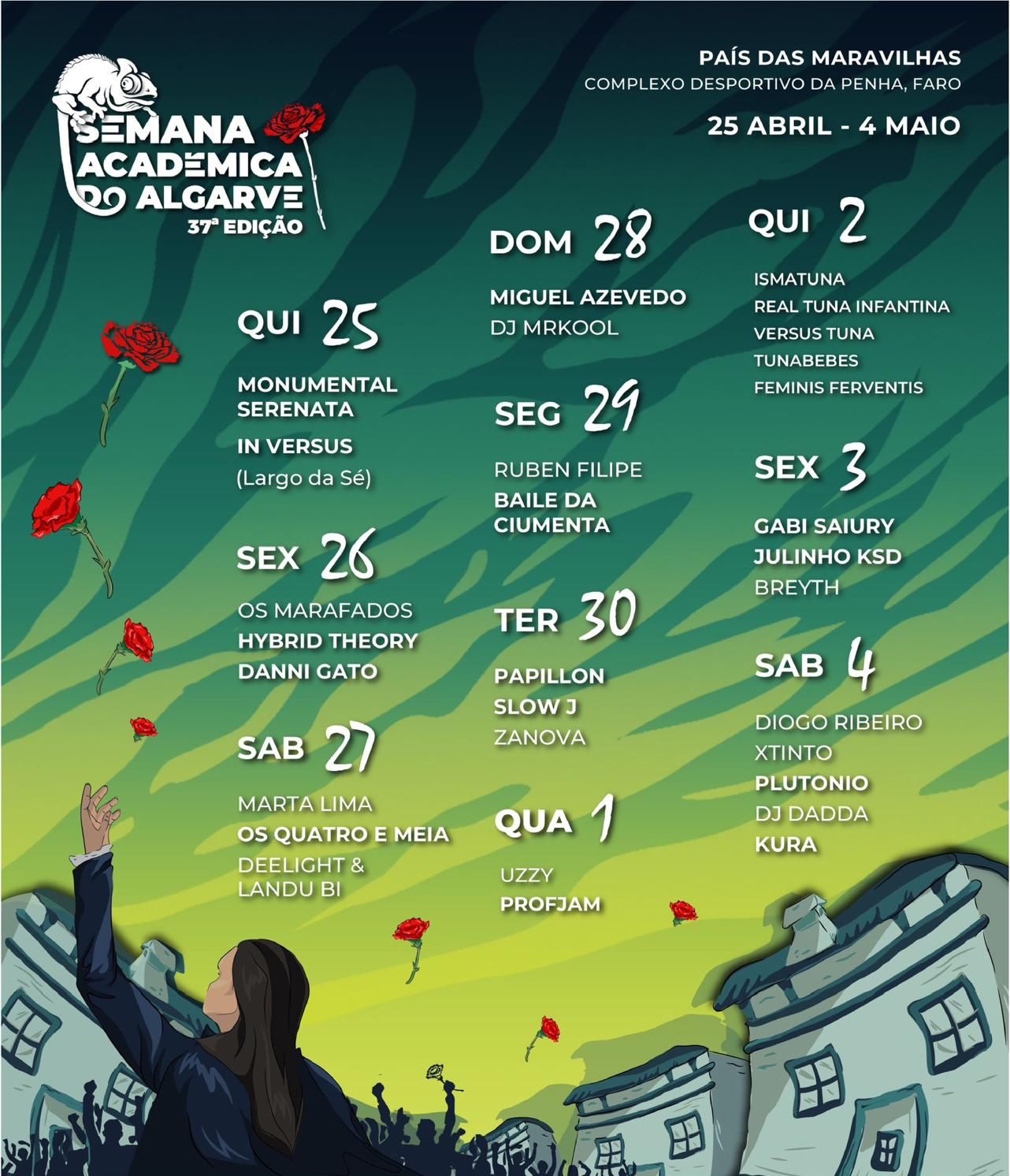 A Monumental Serenata dará início às festividades no dia 25 de abril, no Largo da Sé, com a atuação emocionante dos In Versus, fortalecendo os laços e a união da tradição académica. Este ano, em especial, ao celebrarmos os 50 anos do 25 de abril, reafirmamos valores como liberdade, democracia e responsabilidade cívica, essenciais para o desenvolvimento dos estudantes e o crescimento da nossa Academia.