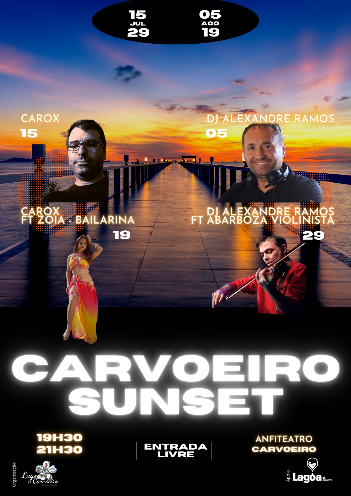Nos dias 15 e 29 de julho e 5 e 19 de agosto das 19h30 às 21h30, junte-se a nós no Anfiteatro da Praia do Carvoeiro para um momento de celebração com a música do Carox e do DJ Alexandre Ramos (dia 29 de julho - DJ Alexandre Ramos FT Abarboza Violinista e no dia 19 de agosto – Carox FT Zoia – Bailarina).