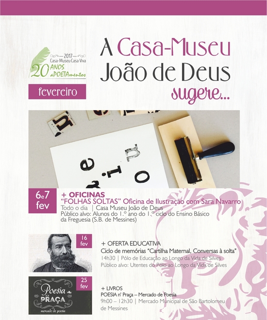 A primeira destas atividades tem lugar nos dias 6 e 7 de fevereiro e trará à Casa-Museu a escultora e investigadora Sara Navarro, que irá dinamizar a oficina de ilustração “Folhas Soltas”. A iniciativa decorrerá durante o dia todo e é dirigida aos alunos do 1.º ano do 1.º ciclo do ensino básico da freguesia de SB Messines.