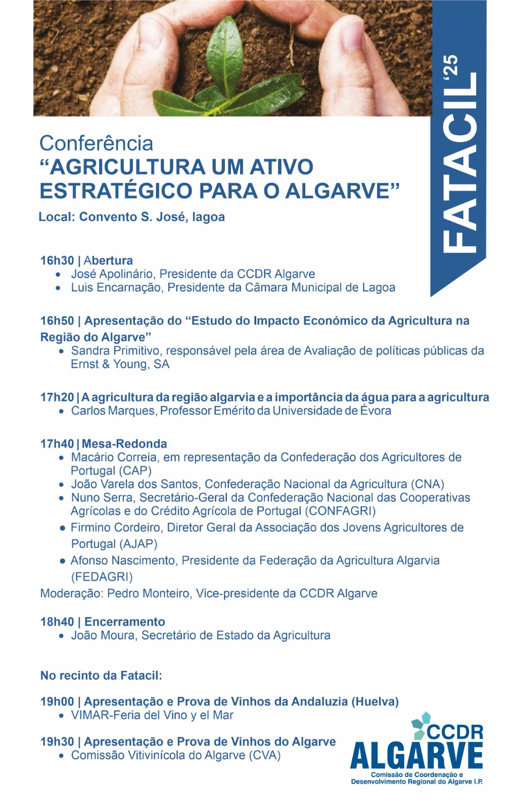 Já no espaço Amar a Terra, no recinto da FATACIL, e em complemento a este momento de reflexão estratégica, terão lugar as apresentações e provas de vinhos da Comissão Vitivinícola do Algarve (CVA) e da VIMAR – Feria del Vino y el Mar, sublinhando a importância da cooperação entre o Algarve e a Andaluzia, reforçando a partilha de conhecimento, produtos e identidade mediterrânica.