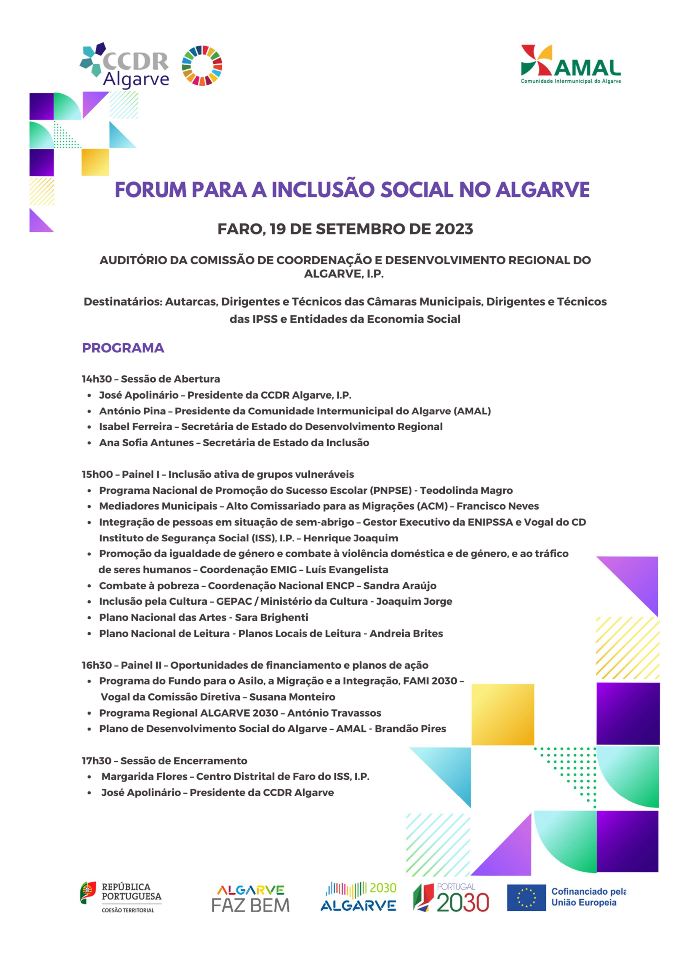 Na sessão de abertura está prevista a participação das Secretárias de Estado da Inclusão Social, Ana Sofia Antunes, e do Desenvolvimento Regional, Isabel Ferreira, bem como do Presidente da AMAL, António Miguel Pina. O encerramento será efetuado por Margarida Flores, Diretora Distrital do ISS, I.P. e José Apolinário, Presidente da CCDR Algarve e do Programa Regional ALGARVE 2030, nos termos do programa disponível AQUI.