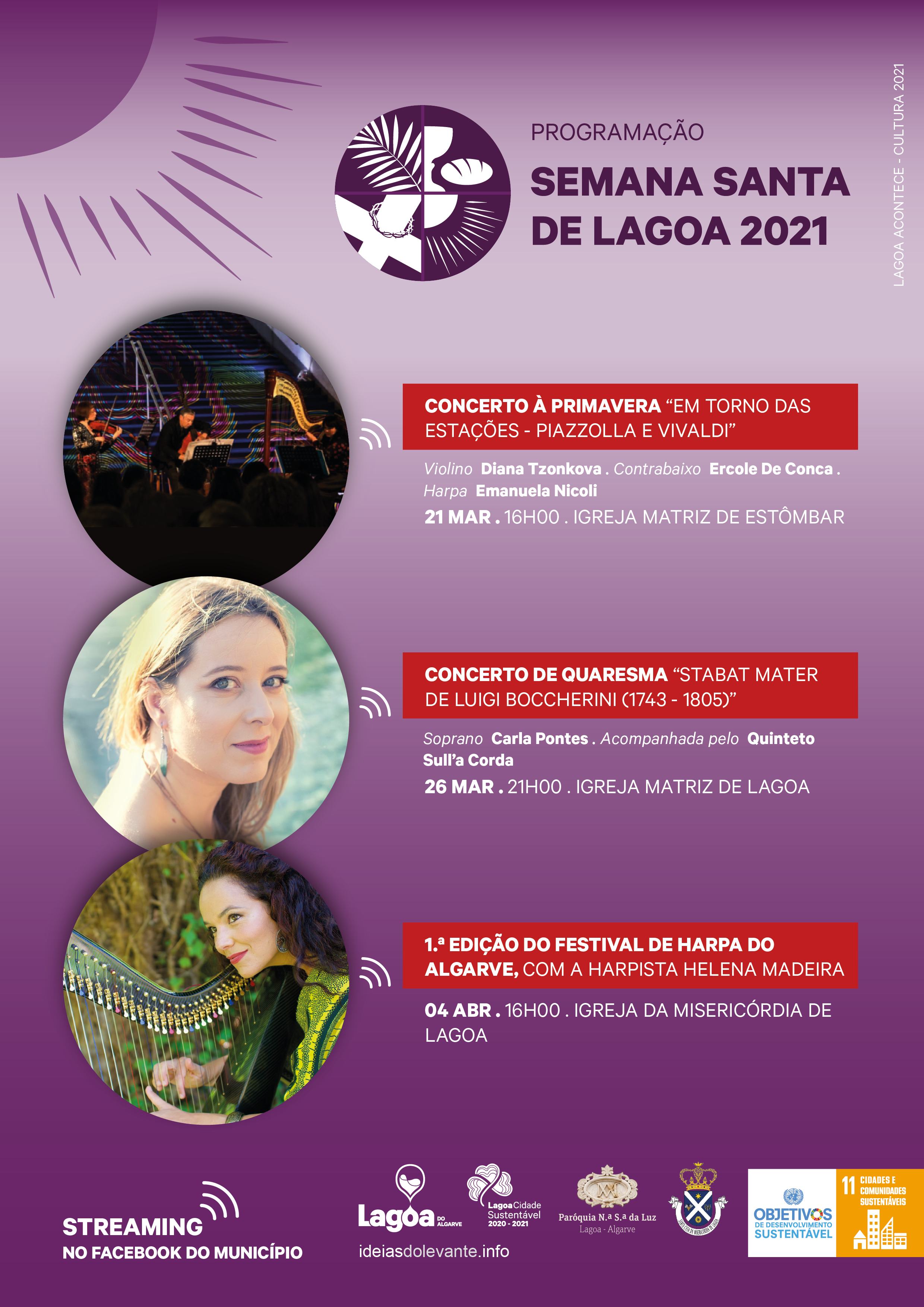 Apesar de ainda estarmos a viver as medidas restritivas impostas pela situação pandémica, o Município de Lagoa irá assinalar a Semana Santa através de uma programação cultural com diversos concertos que serão transmitidos via streaming pelas redes sociais do Município.