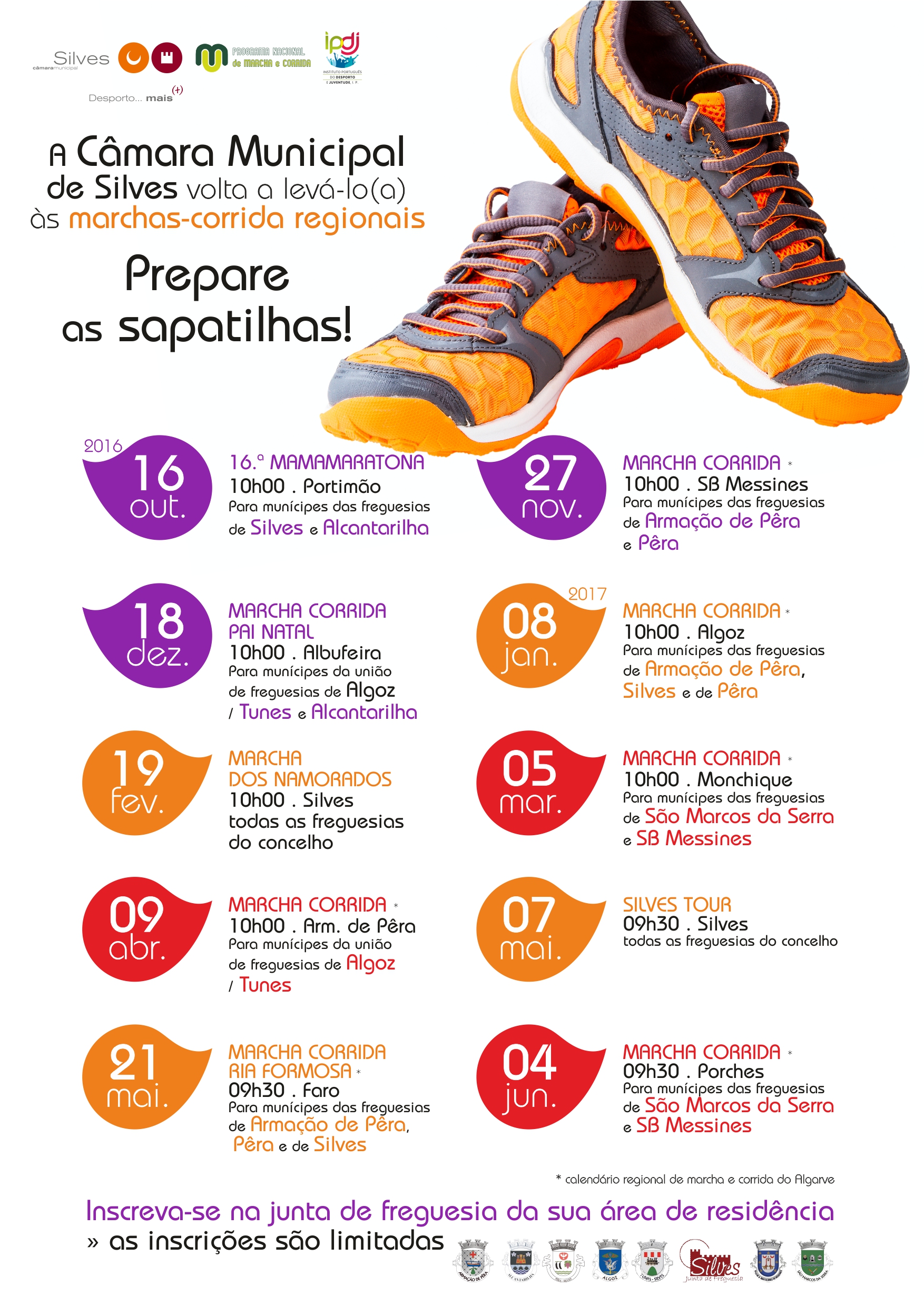 O calendário de participações de Silves e locais de passagem do autocarro poderão ser consultados em http://www.cm-silves.pt/pt/destaques/2334/centro-municipal-de-marcha-e-corrida-de-silves-diculga-calendario-de-marchas-para-2016-2017.aspx.