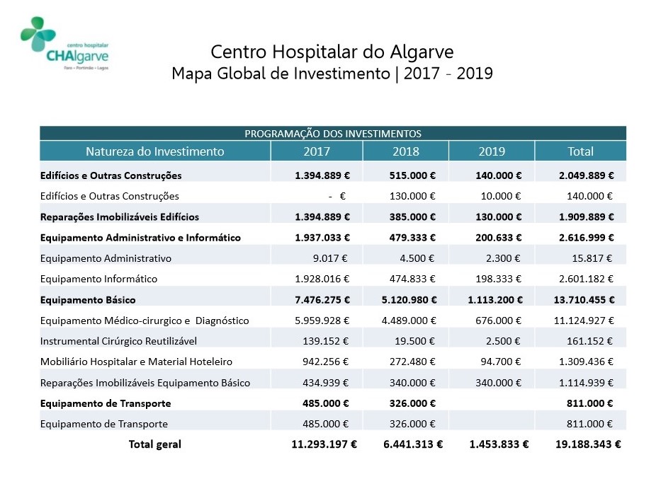 Como acima se referiu 2016 foi o início de um ciclo trienal de requalificação e desenvolvimento da estrutura hospitalar para o qual se prevê um investimento global de 19,2 milhões de euros, dos quais 11,2 milhões se concretizam já em 2017 como se pode verificar na programação que se apresenta no mapa abaixo.