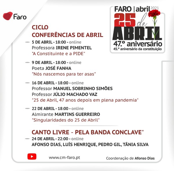 O Município de Faro convida a população a participar nas comemorações do Dia da Liberdade e a assistir às sessões em direto no canal Youtube do Município de Faro, em
