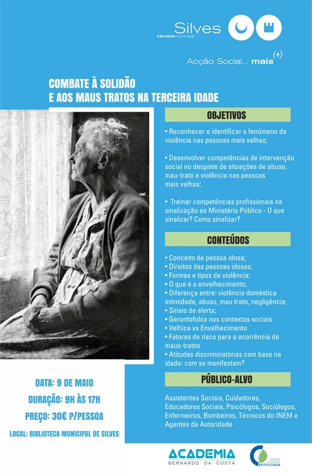 Reconhecer e identificar o fenómeno da violência nas pessoas mais velhas; desenvolver competências de intervenção social no despiste de situações de abuso, mau-trato e violência nas pessoas mais velhas; e treinar competências profissionais na sinalização ao Ministério Público são alguns dos objetivos desta ação dirigida a Assistentes Sociais, Cuidadores, Educadores Sociais, Psicólogos, Sociólogos, Enfermeiros, Bombeiros, Técnicos do INEM e Agentes da Autoridade.