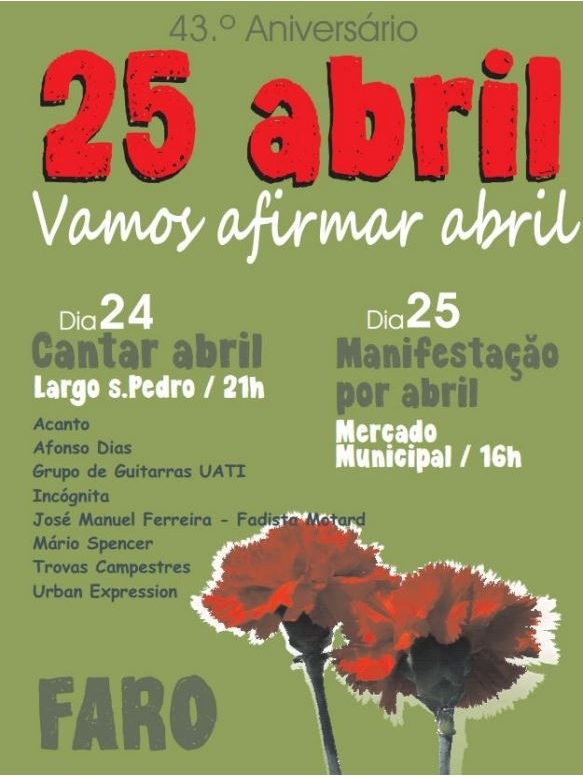 No dia 25 de Abril, com início no Largo do Mercado, às 16 horas, decorrerá a manifestação por Abril, que percorrerá as principais artérias da cidade de Faro.