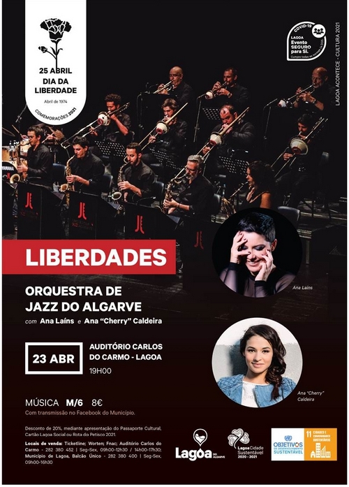 No próximo dia 23 de abril, pelas 19h00, sobe ao palco do Auditório Carlos do Carmo a Orquestra de Jazz do Algarve, para apresentar o concerto “Liberdades”. O espetáculo conta ainda com as participações das cantoras Ana Laíns e Ana “Cherry” Caldeira.