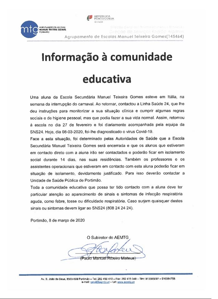 “Uma aluna da Escola Secundária Manuel Teixeira Gomes esteve em Itália, na semana de interrupção do Carnaval. Ao retornar, contactou a Linha Saúde 24, que lhe deu instruções para monitorizar a sua situação clínica e cumprir algumas regras sociais e de higiene pessoal, mas que podia fazer a sua vida normal”, adianta a nota divulgada na página na internet do Agrupamento de Escolas Manuel Teixeira Gomes em Portimão.