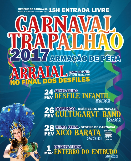 Tendo como tema central o “Cinema”, Armação de Pêra tem no seu programa os habituais cortejos de domingo e terça-feira, com início às 15h00, junto ao Hotel Holiday Inn Algarve e que irão percorrer toda a Avenida Frente-Mar. A edição que conta, previsivelmente, com a participação duas dezenas de carros alegóricos, apresentará, também duas novidades: um Desfile Infantil na sexta-feira, dia 24 de fevereiro e o Enterro do Entrudo, no dia 1 de março. No final dos desfiles haverá, também, um arraial na zona da Lota, com “Cultugarve Band", no domingo, e com "Xico Barata", na terça-feira, num recinto onde as entidades organizadoras desta edição irão ter barraquinhas de comes e bebes. A iniciativa conta ainda com a participação especial do grupo Percutunes, APEXA, Amigos dos Veículos Clássicos do Barlavento e Cultugarve. Também o programa RTP Mais Perto estará em direto durante a "terça-feira gorda" com uma emissão de 6 horas a partir desta vila. De referir que o Carnaval Trapalhão de Armação de Pêra é uma iniciativa organizada pela Junta de Freguesia local, Agrupamento Escolas Silves Sul, Associação de Pais Apa, Casa do Povo de Alcantarilha, Pêra e Armação de Pêra, Clube de Futebol «Os Armacenenses», Agrupamento 0598 - Armação de Pêra, Polis Apoteose e Associação Amigos de Armação.