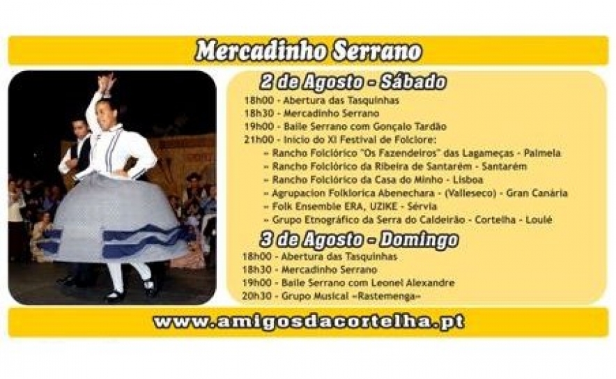 Dias 2 e 3 de Agosto é mais uma vez dia de festa na tradicional aldeia da Cortelha, localizada no interior do Concelho de Loulé. Depois do sucesso de anos anteriores, estão de regresso os Manjares Serranos, que revelam o melhor da cozinha serrana, acompanhados pelo Festival de Folclore da Serra do Caldeirão.