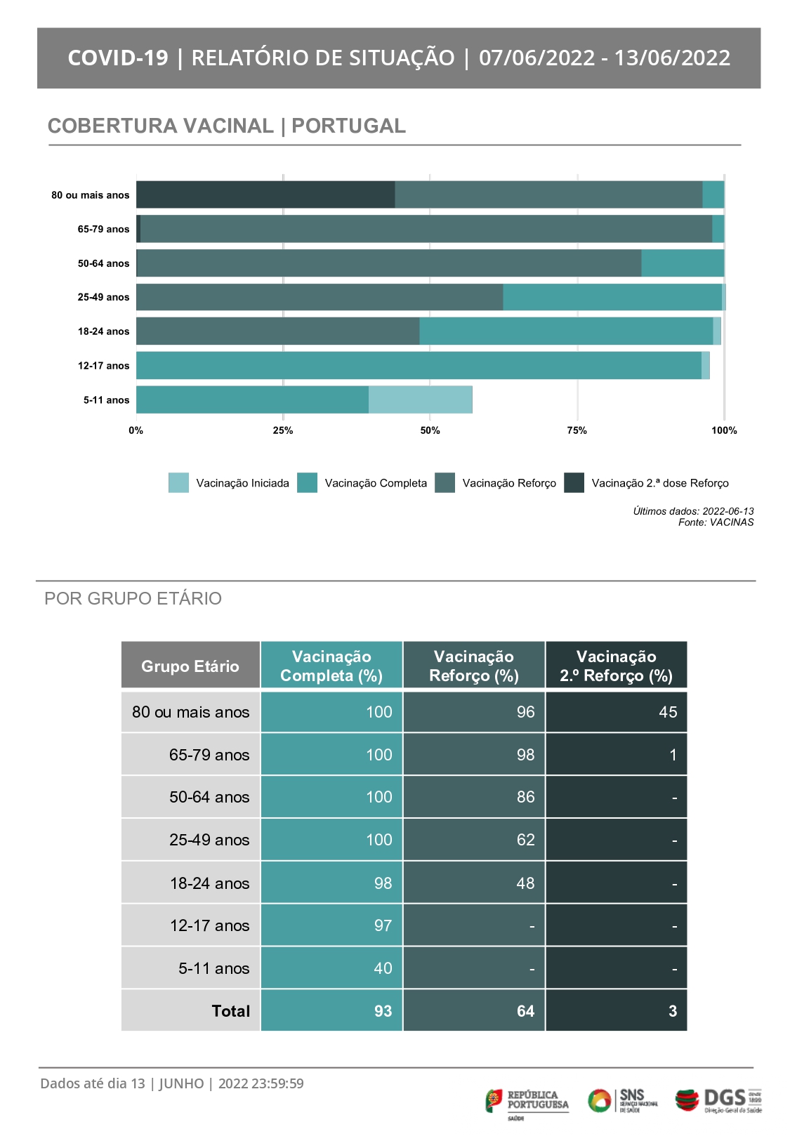 Relativamente à vacinação contra a covid-19, o boletim refere que 93% da população tem a vacinação completa, 64% dos elegíveis a primeira dose de reforço e 45% dos idosos com 80 ou mais anos a segunda dose para reforçar a imunização contra o SARS-CoV-2.