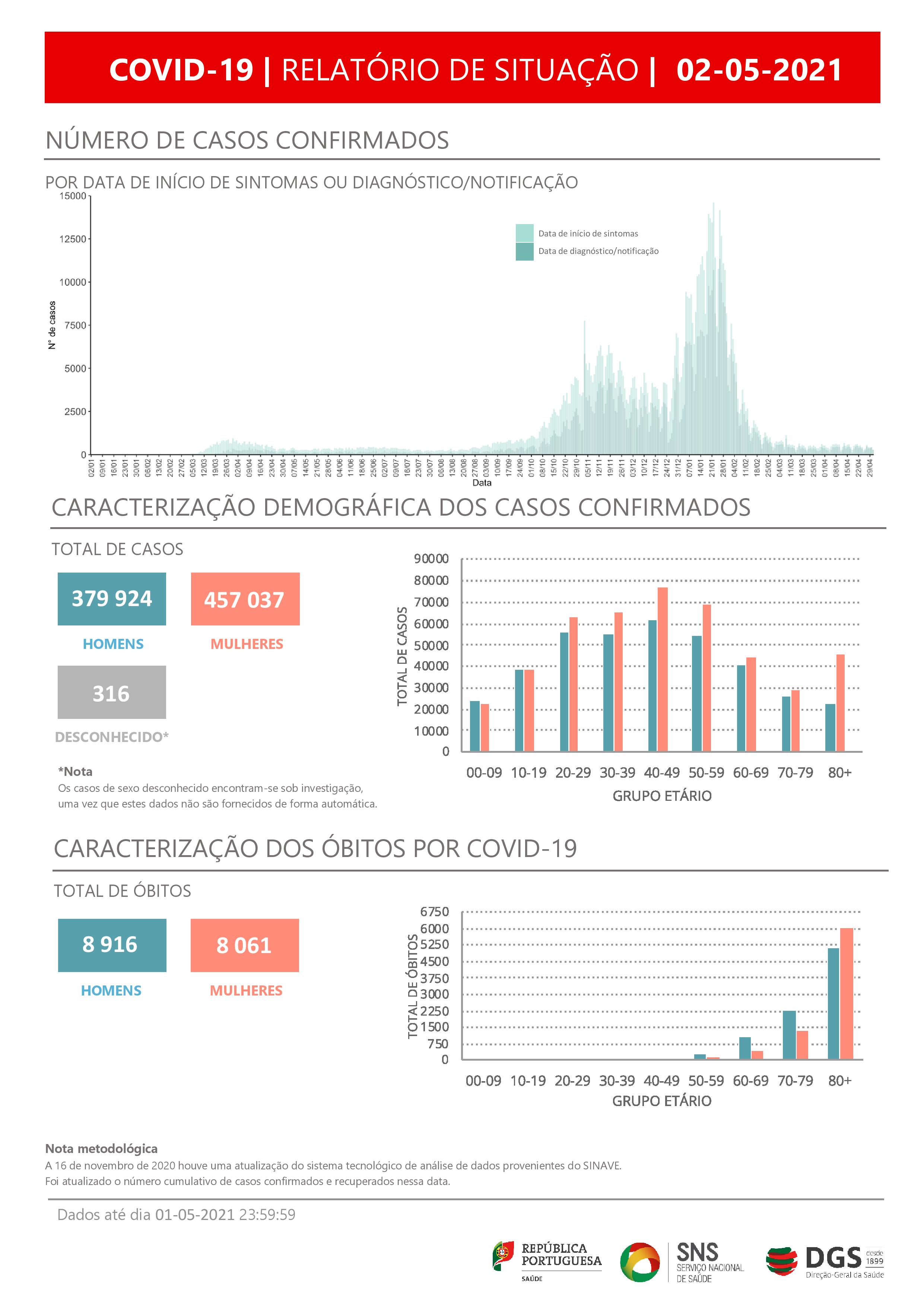 O novo coronavírus já infetou em Portugal pelo menos 379.924 homens e 457.037 mulheres, mostram os dados da DGS, segundo os quais há 316 casos de sexo desconhecido, que se encontram sob investigação, uma vez que esta informação não é fornecida de forma automática.