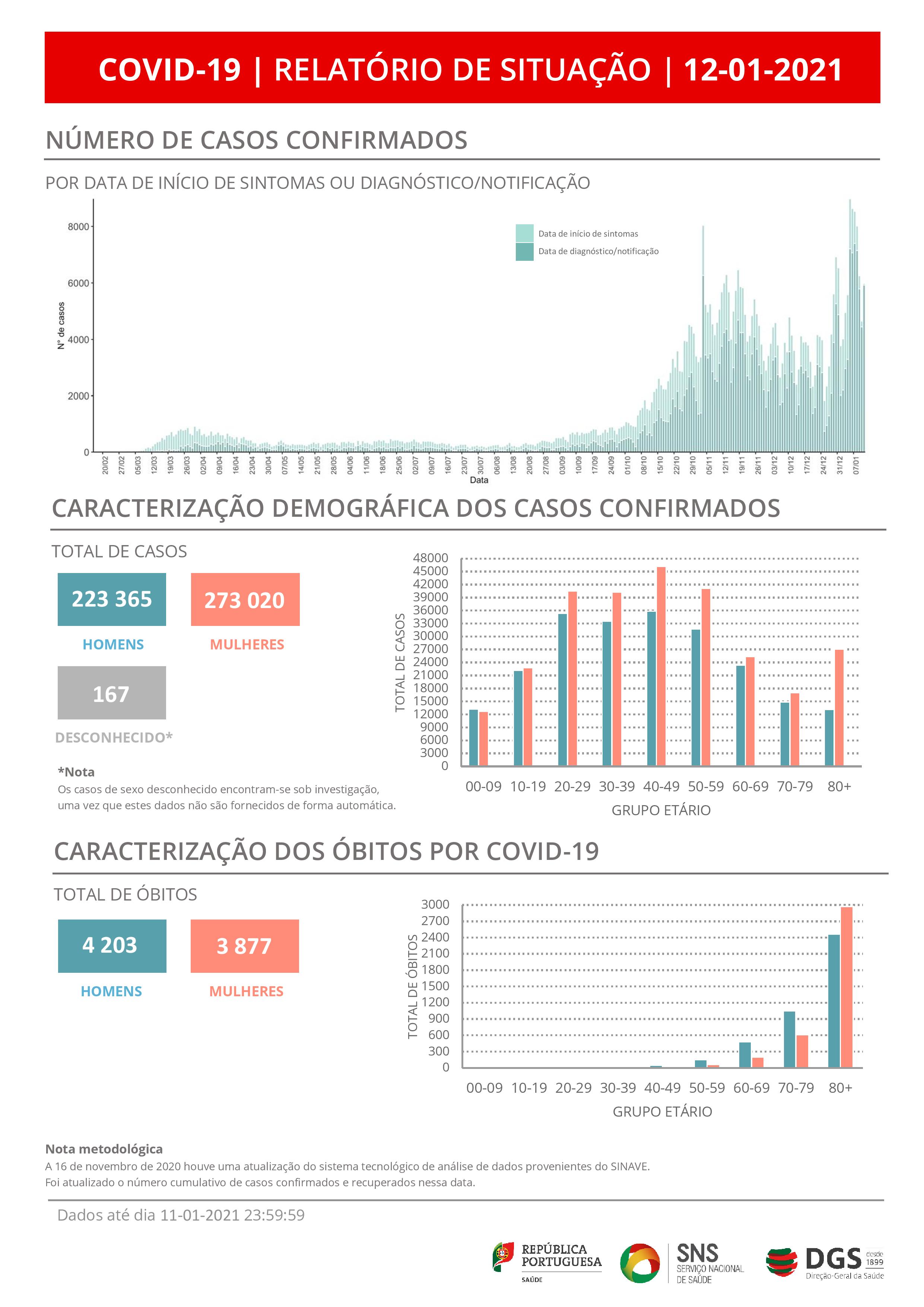 O novo coronavírus já infetou em Portugal pelo menos 223.365 homens e 273.020 mulheres, referem os dados da DGS, segundo os quais há 167 casos de sexo desconhecido, que se encontram sob investigação, uma vez que estes dados não são fornecidos de forma automática.