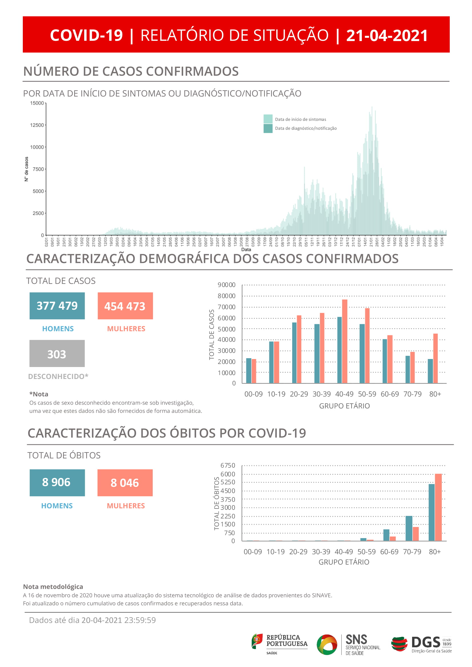 O novo coronavírus já infetou em Portugal pelo menos 377.479 homens e 454.473 mulheres, mostram os dados da DGS, segundo os quais há 303 casos de sexo desconhecido, que se encontram sob investigação, uma vez que esta informação não é fornecida de forma automática.