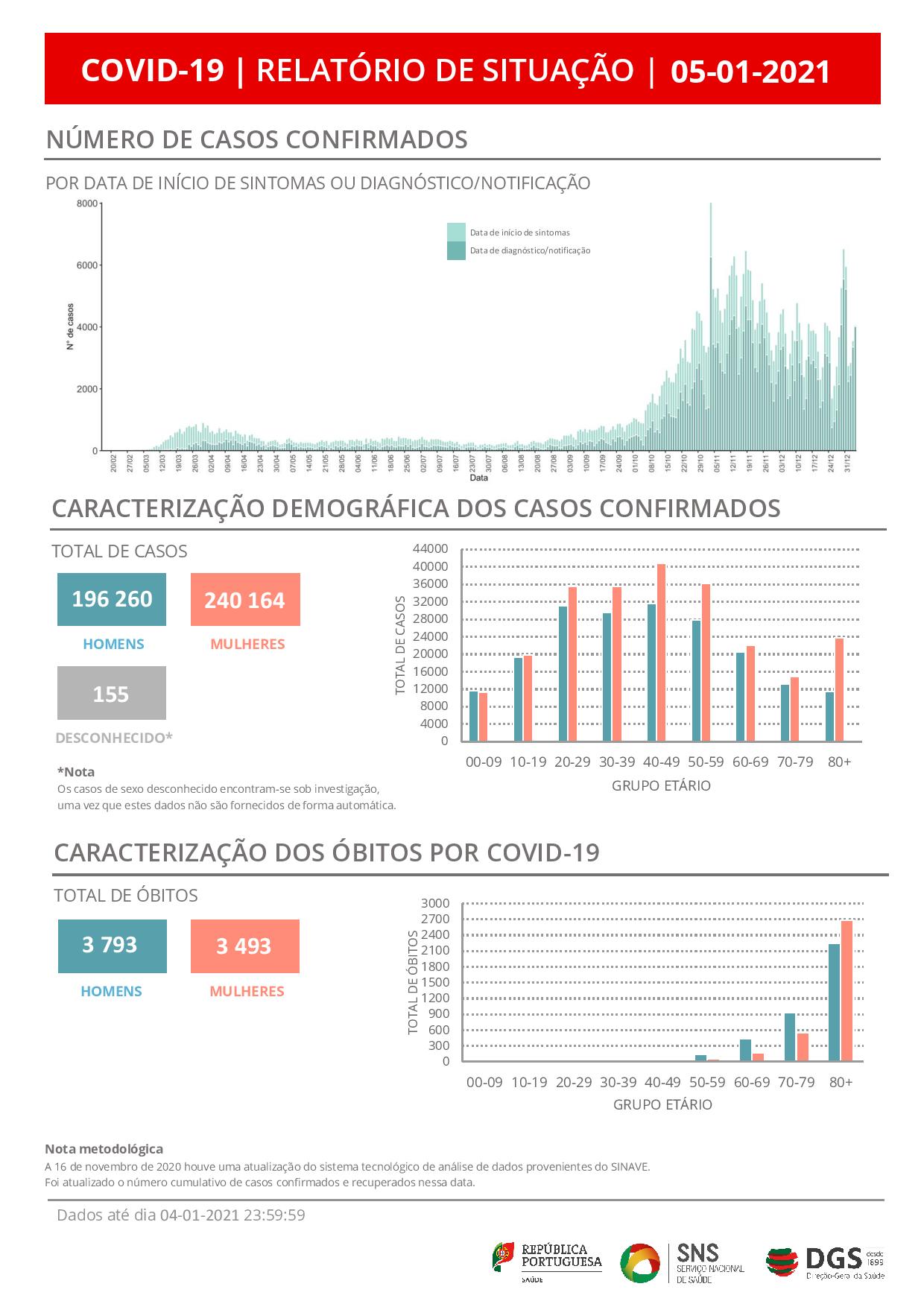 O novo coronavírus já infetou em Portugal pelo menos 196.260 homens e 240.164 mulheres, referem os dados da DGS, segundo os quais há 155 casos de sexo desconhecido, que se encontram sob investigação, uma vez que estes dados não são fornecidos de forma automática.