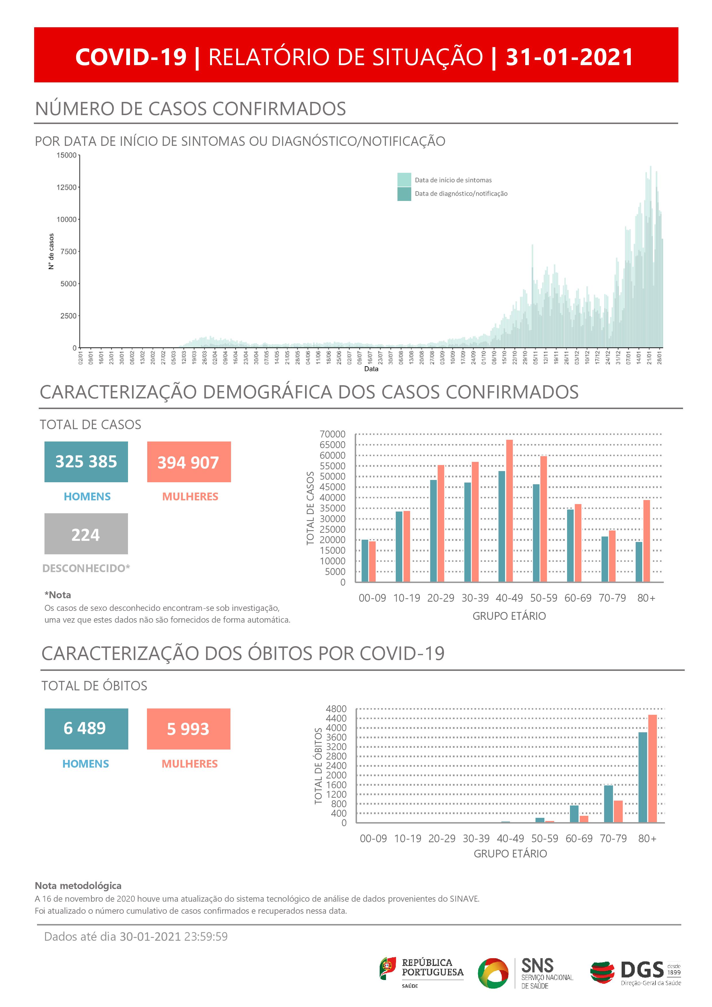O SARS-CoV-2 já infetou em Portugal, pelo menos, 394.907 mulheres e 325.385 homens, referem os dados da DGS, segundo os quais há 224 casos de sexo desconhecido, que se encontram sob investigação, uma vez que estes dados não são fornecidos de forma automática.