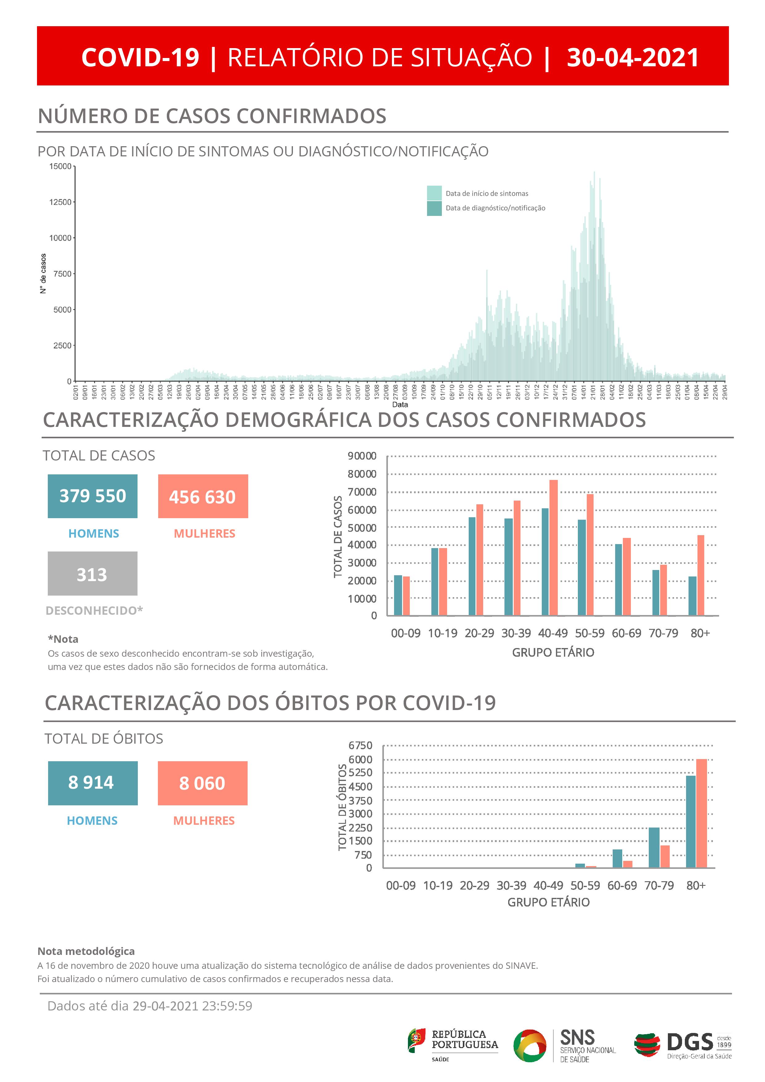 O novo coronavírus já infetou em Portugal pelo menos 379.550 homens e 456.630 mulheres, mostram os dados da DGS, segundo os quais há 313 casos de sexo desconhecido, que se encontram sob investigação, uma vez que esta informação não é fornecida de forma automática.