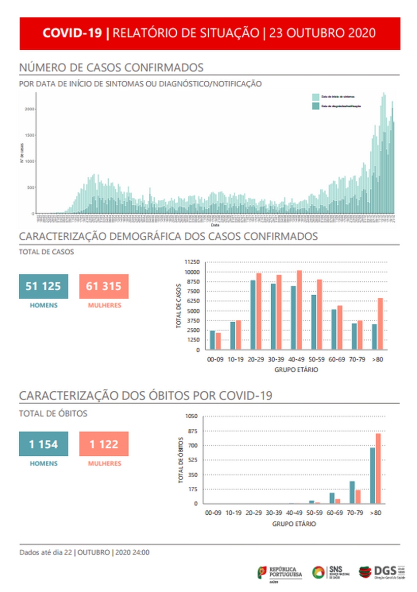 No total, o novo coronavírus já afetou em Portugal pelo menos 51.125 homens e 61.315 mulheres, de acordo com os casos declarados.