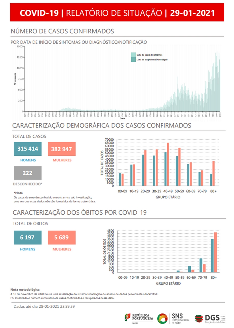 O novo coronavírus já infetou em Portugal pelo menos 315.414 homens e 382.947 mulheres, referem os dados da DGS, segundo os quais há 222 casos de sexo desconhecido, que se encontram sob investigação, uma vez que estes dados não são fornecidos de forma automática.