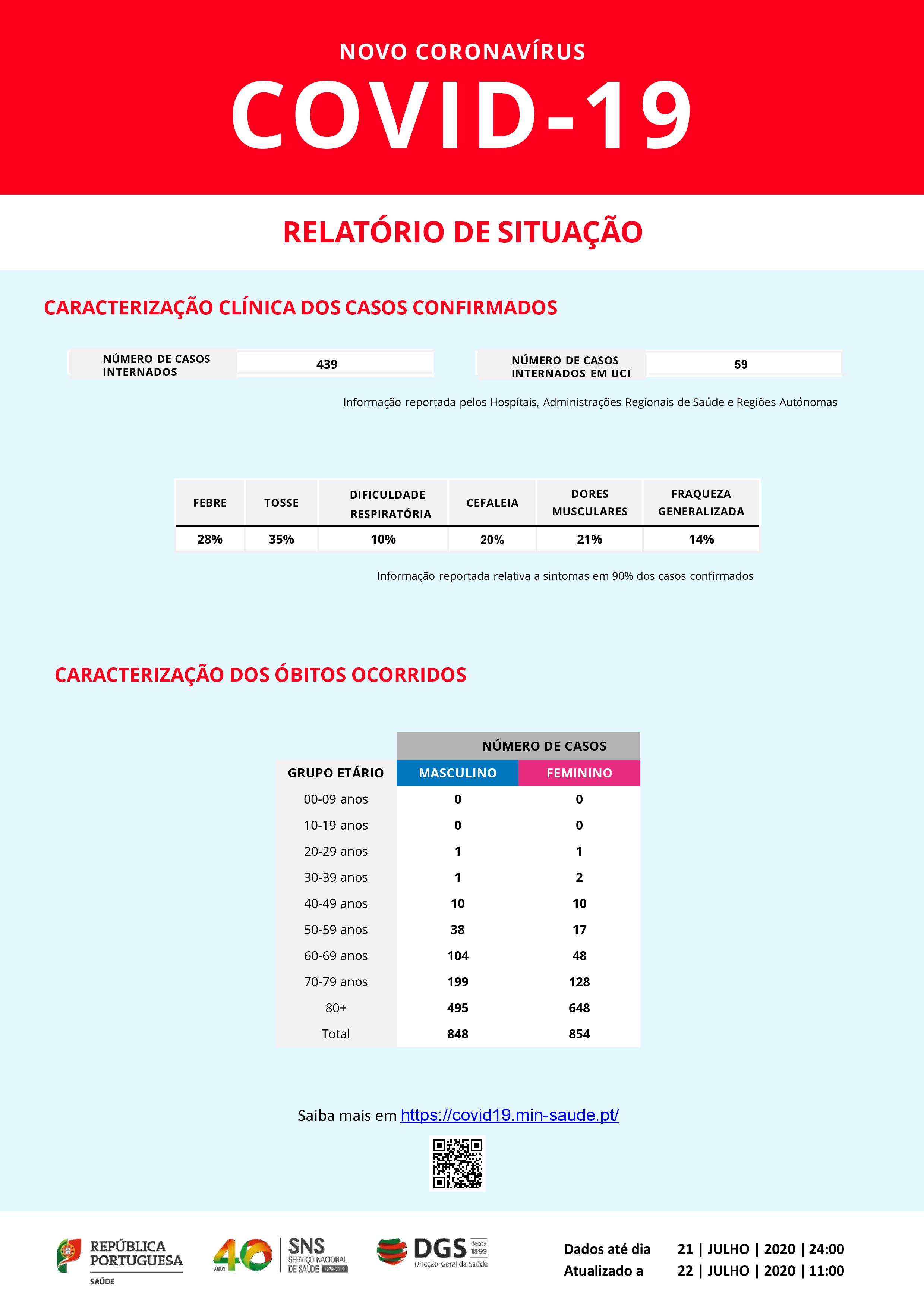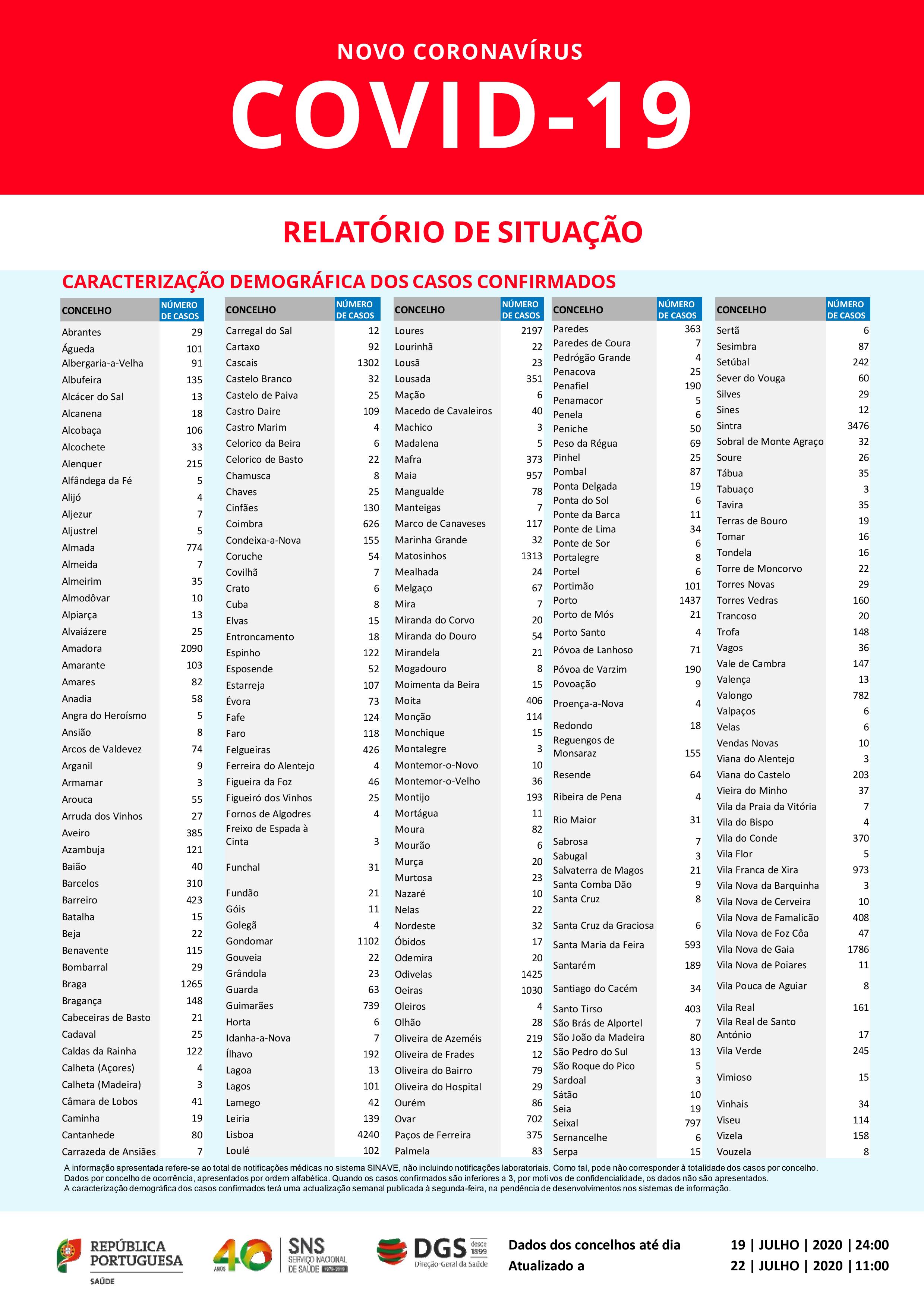 Em relação à informação sobre os casos por concelho, a DGS recorda que apenas é atualizada às segundas-feiras, pelo que os três concelhos com mais casos confirmados indicados no boletim continuam a ser Lisboa (4.240), Sintra (3.476) e Loures (2.197).