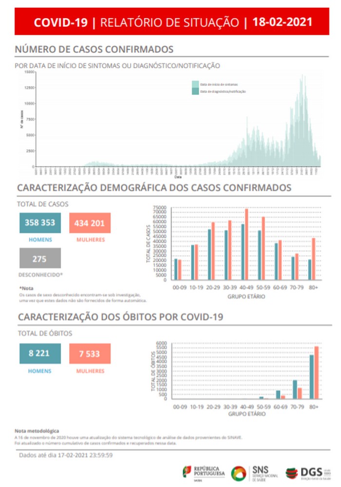 O novo coronavírus já infetou em Portugal, pelo menos, 358.353 homens e 434.201 mulheres, referem os dados da DGS, segundo os quais há 275 casos de sexo desconhecido, que se encontram sob investigação, uma vez que estes dados não são fornecidos de forma automática.