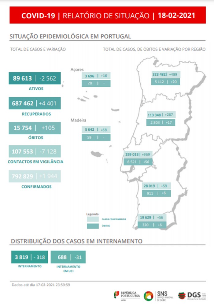 Na região Centro, registaram-se mais 287 casos, acumulando-se 113.348 infeções e 2.803 mortos.