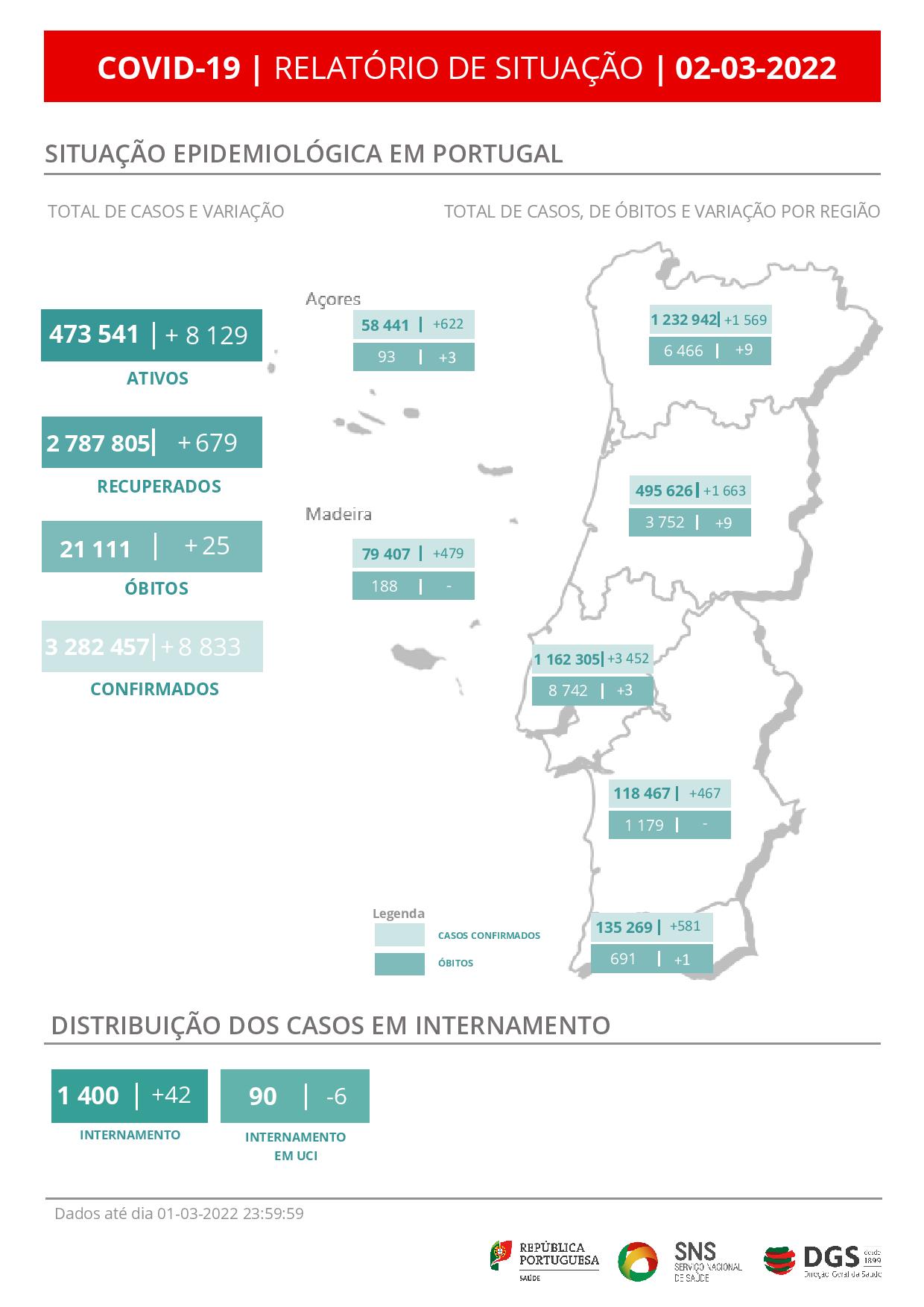 Portugal registou 8.833 novas infeções com o coronavírus SARS-CoV-2 nas últimas 24 horas, mais 25 óbitos associados à covid-19 e um aumento nos internamentos em enfermaria, indicou hoje a Direção-Geral da Saúde (DGS).