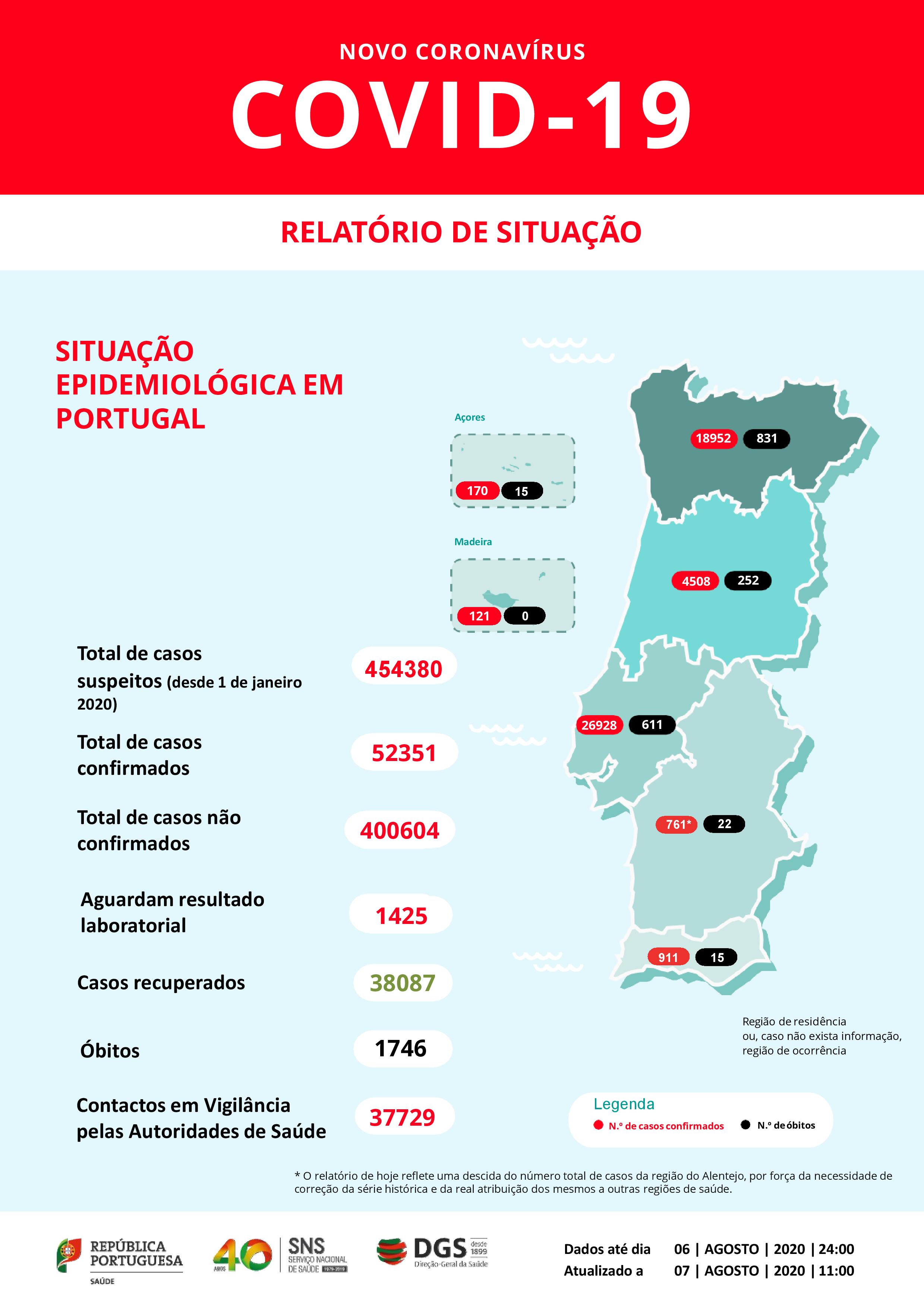 De acordo com o relatório da DGS sobre a situação epidemiológica, desde o início da pandemia até hoje registaram-se 52.351 casos de infeção confirmados e 1.746 mortes, das quais três na região de Lisboa nas últimas 24 horas.