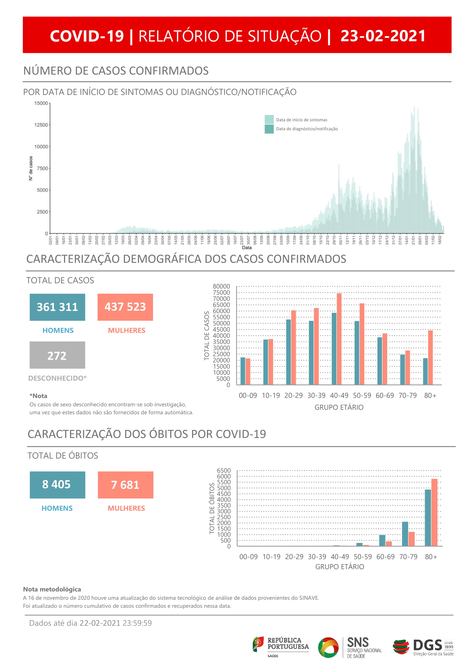 O novo coronavírus já infetou em Portugal, pelo menos, 361.311 homens e 437.523 mulheres, referem os dados da DGS, segundo os quais há 272 casos de sexo desconhecido, que se encontram sob investigação, uma vez que estes dados não são fornecidos de forma automática.