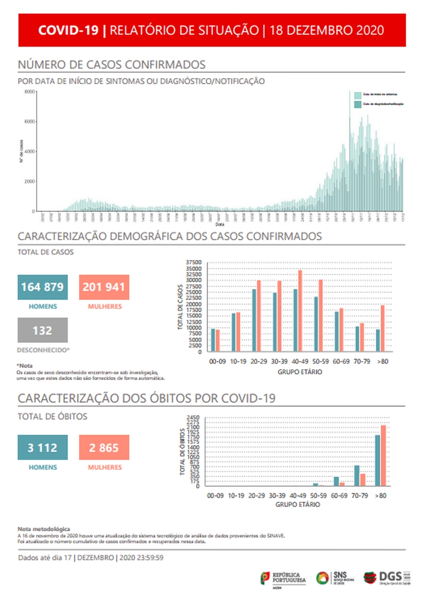 O novo coronavírus já infetou em Portugal pelo menos 164.879 homens e 201.941 mulheres, referem os dados da DGS, segundo os quais há 132 casos de sexo desconhecido, que se encontram sob investigação, uma vez que estes dados não são fornecidos de forma automática.