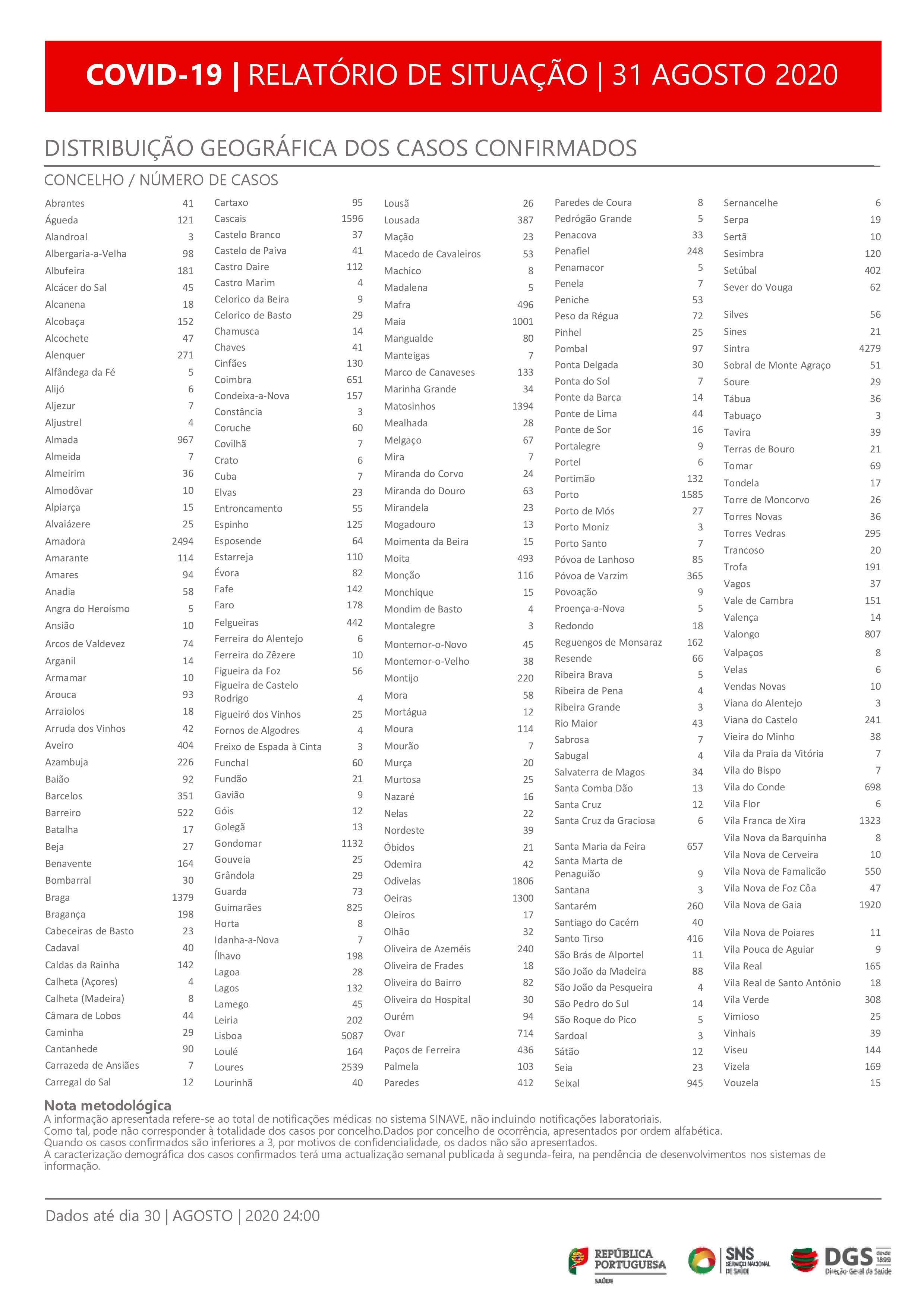 O boletim de hoje divulga os números de casos por concelhos, sendo Lisboa o que apresenta mais infeções, um total de 5.087, seguido de Sintra (4.279), Loures (2.539), Amadora (2.494), Vila Nova de Gaia (1.920) e Odivelas (1.806).