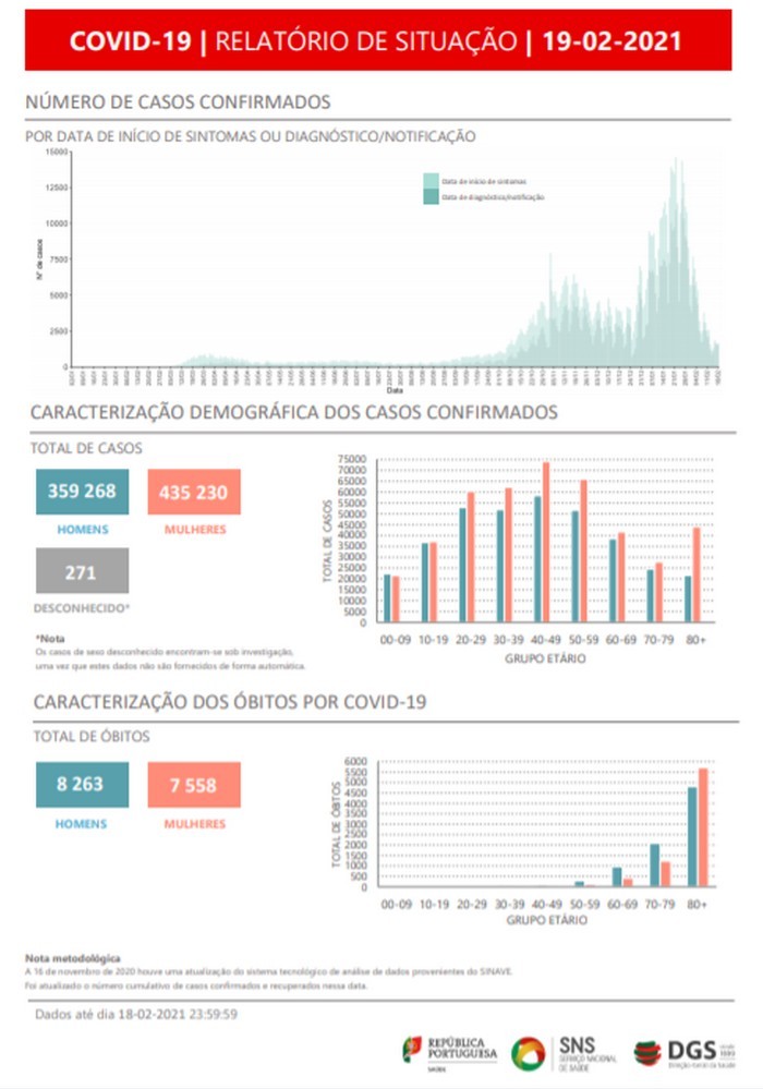 O novo coronavírus já infetou em Portugal, pelo menos, 359.268 homens e 435.230 mulheres, referem os dados da DGS, segundo os quais há 271 casos de sexo desconhecido, que se encontram sob investigação, uma vez que estes dados não são fornecidos de forma automática.