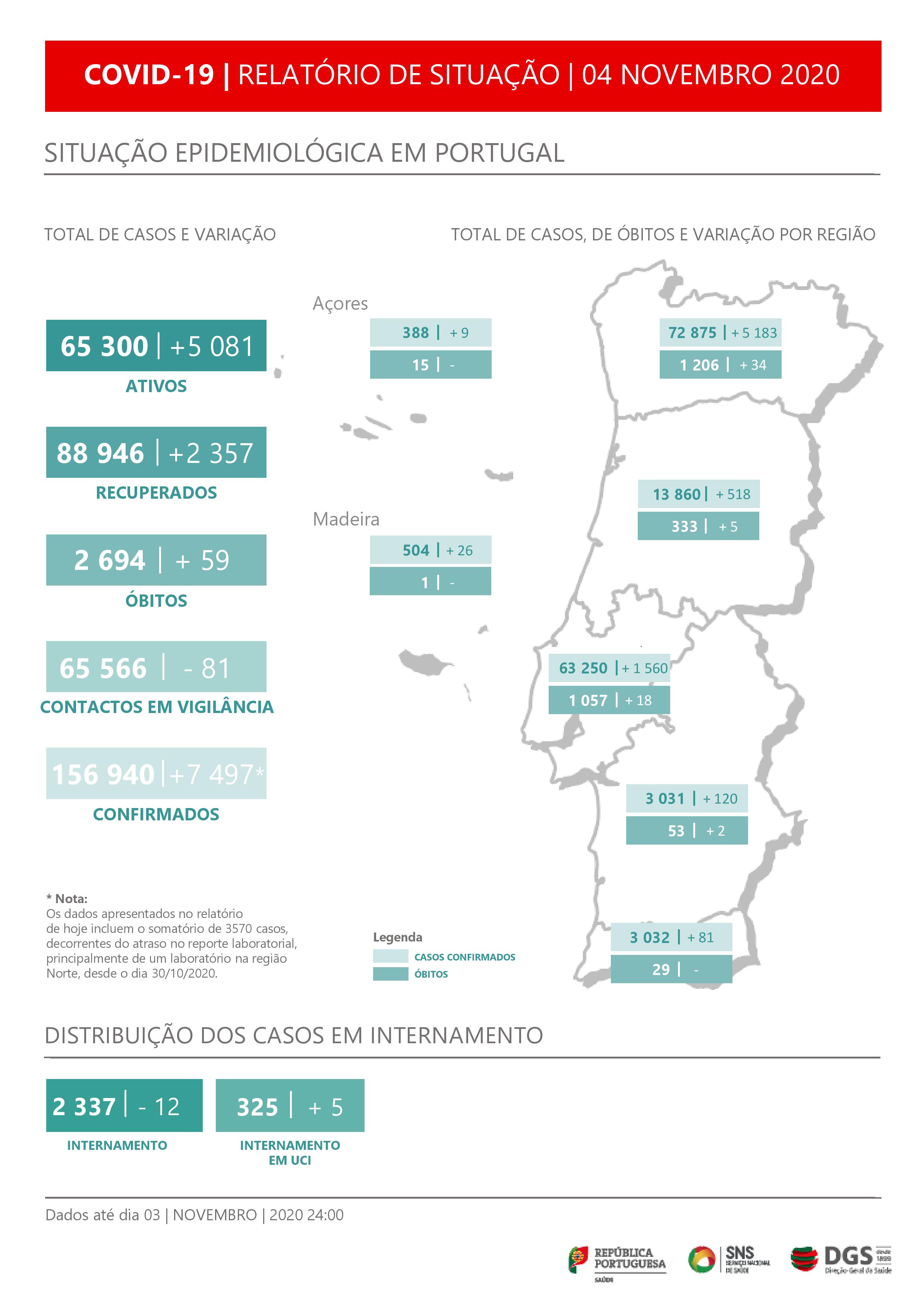 De acordo com o boletim hoje divulgado o número de novos casos inclui o somatório de 3.570 casos, decorrentes do atraso no reporte laboratorial, principalmente de um laboratório na região Norte, desde o dia 30 de outubro.
