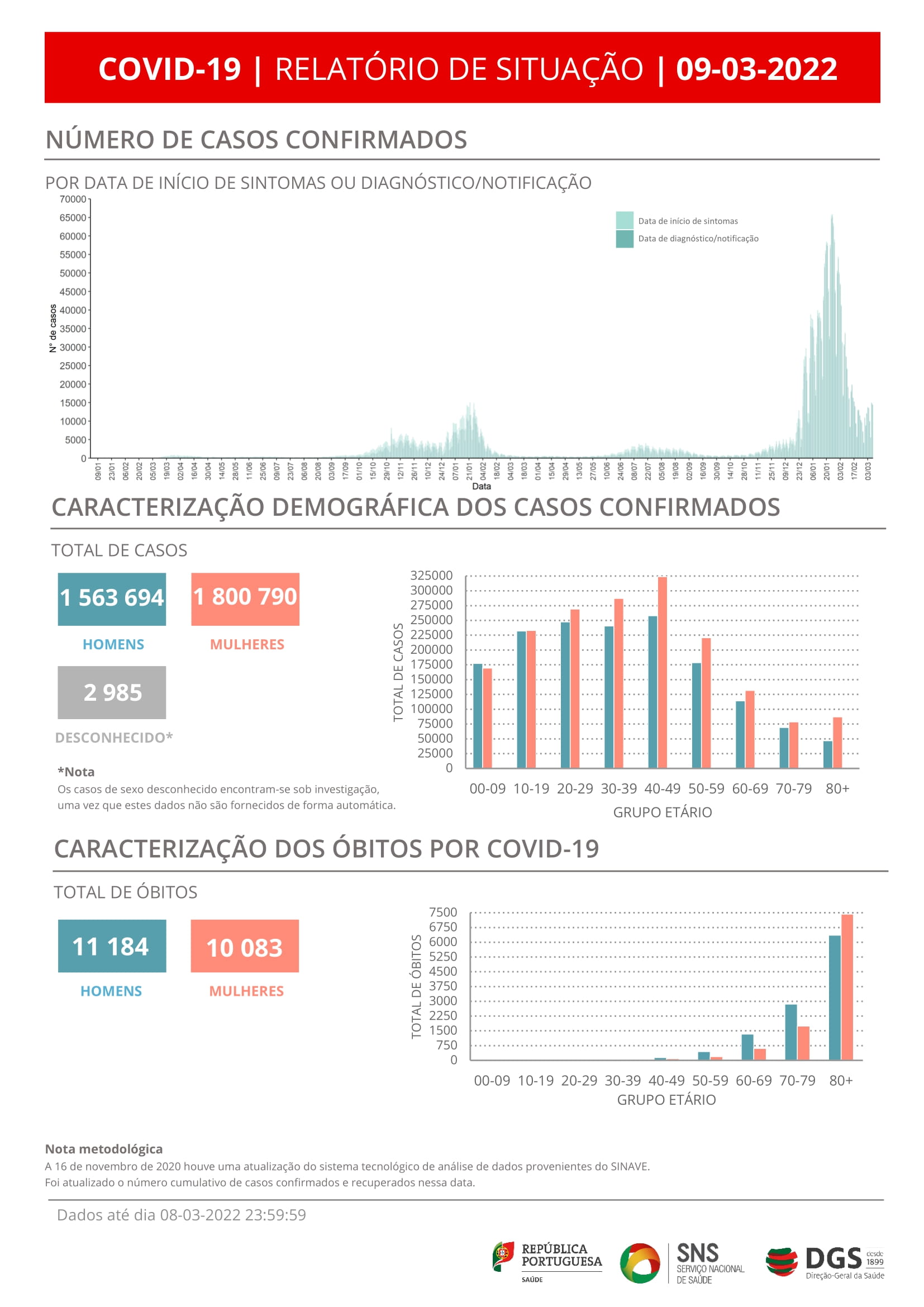 De acordo com DGS, foram contabilizados um total de 3.367.469 casos de infeção em Portugal, sendo 1.800.790 em mulheres e 1.563.694 em homens, com mais 2.985 casos de sexo desconhecido, que se encontram sob investigação, uma vez que esta informação não é fornecida de forma automática.