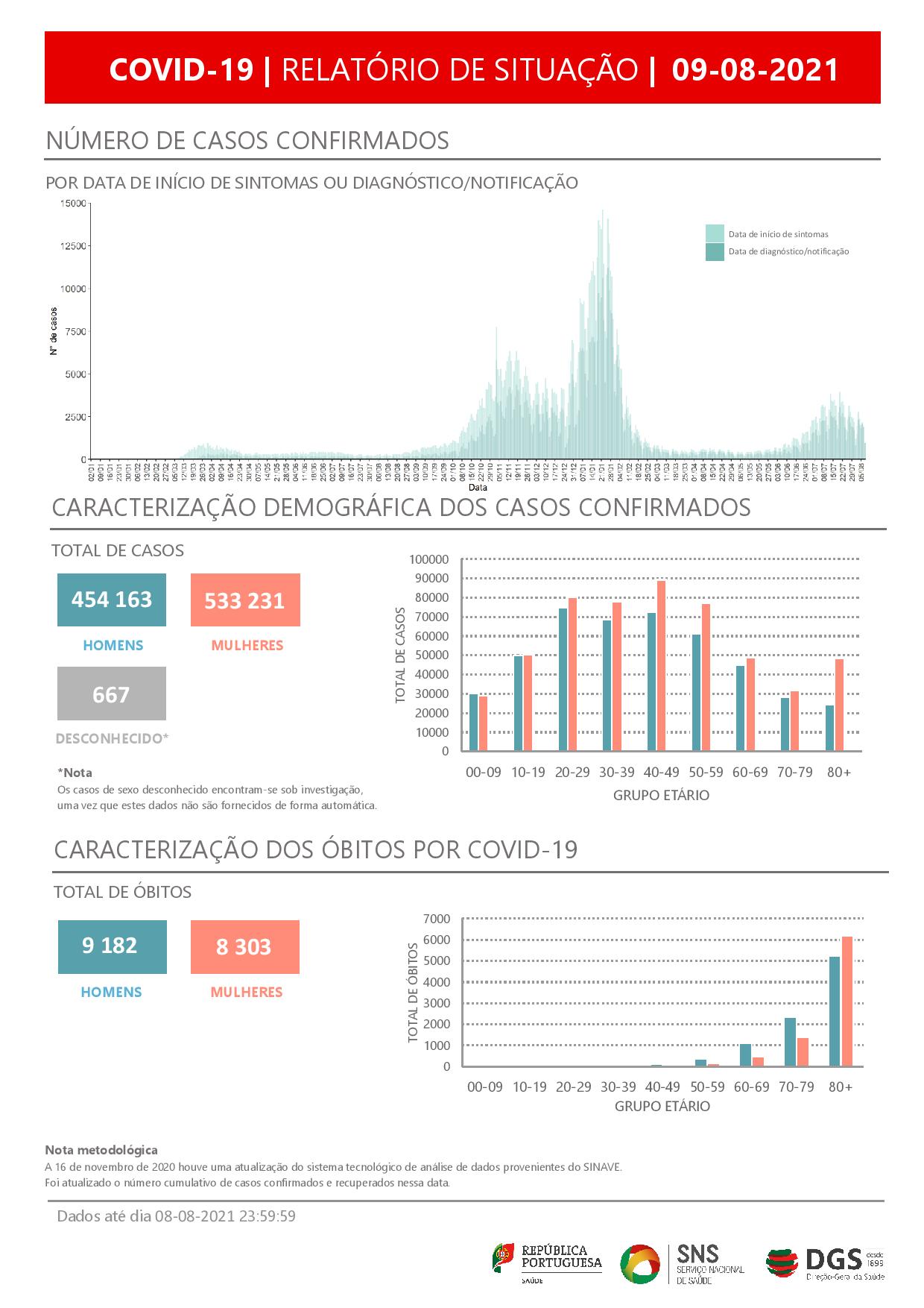 Quanto às infeções o boletim revela que do total de 988.061 pessoas infetadas desde o início da pandemia, 59.142 tinham entre 0 e 9 anos, 100.480 entre 10 e 19 anos, 155.260 entre 20 e 29 anos, 146.500 entre 30 e 39 anos, 161.820 entre 40 e 49 anos, 138.100 entre 50 e 59 anos, 93.691 entre 60 e 69 anos, 60.155 entre 70 e 79 anos e 72.913 com mais de 80 anos.