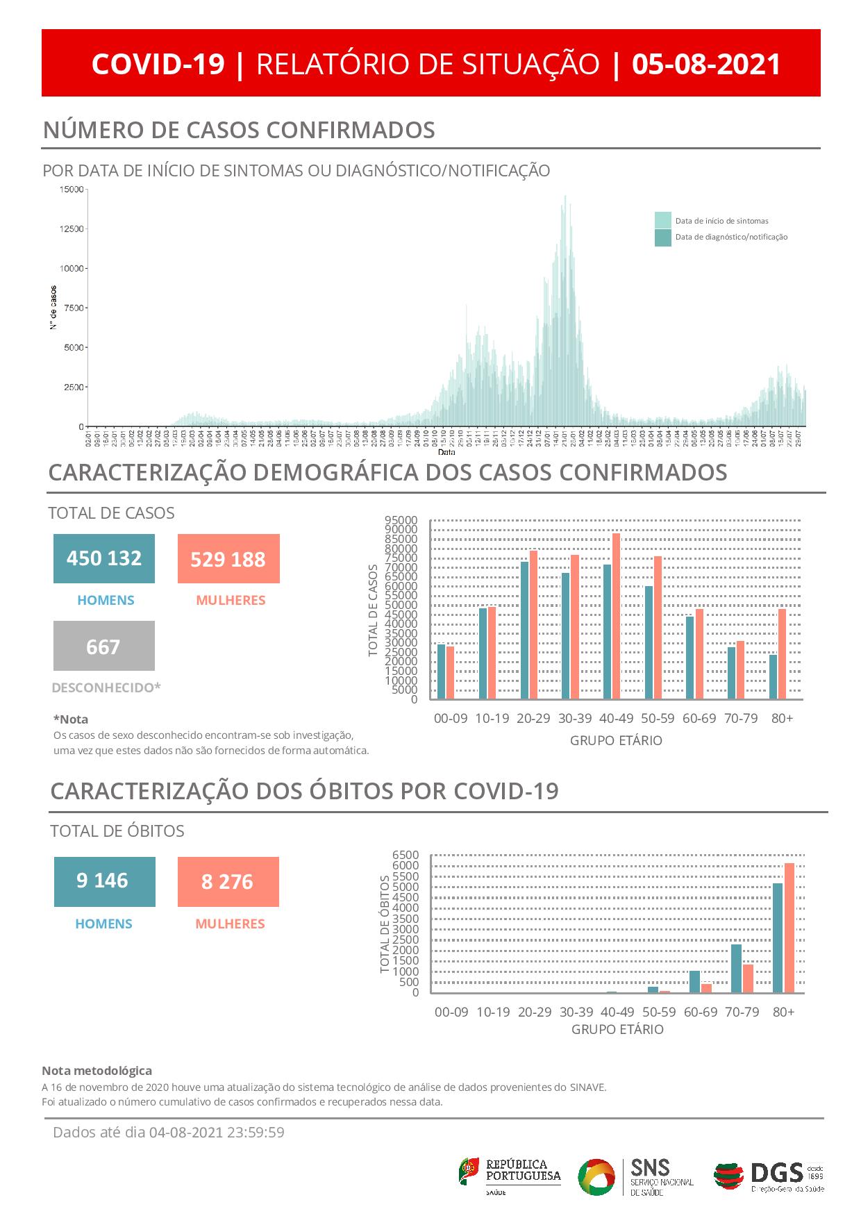 Relativamente às faixas etárias, o boletim revela que do total de mortes notificadas nas últimas 24 horas, sete tinham mais 80 anos, uma entre 70 e 79, uma entre 40 e 49 e uma entre 0 e 9 anos de idade.