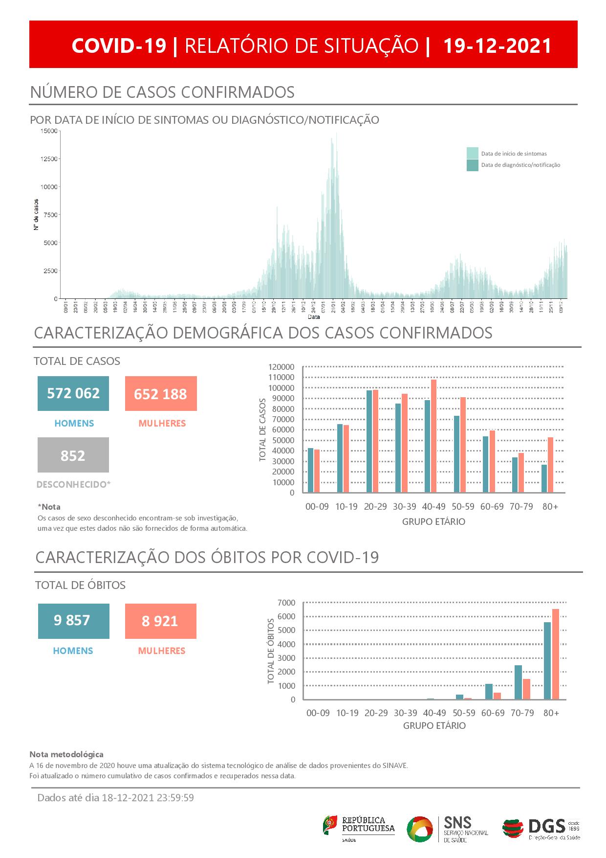 Um total de 572.062 homens e 652.188 mulheres foram infetados, registando-se ainda 9.857 óbitos entre os homens e 8.921 entre as mulheres.