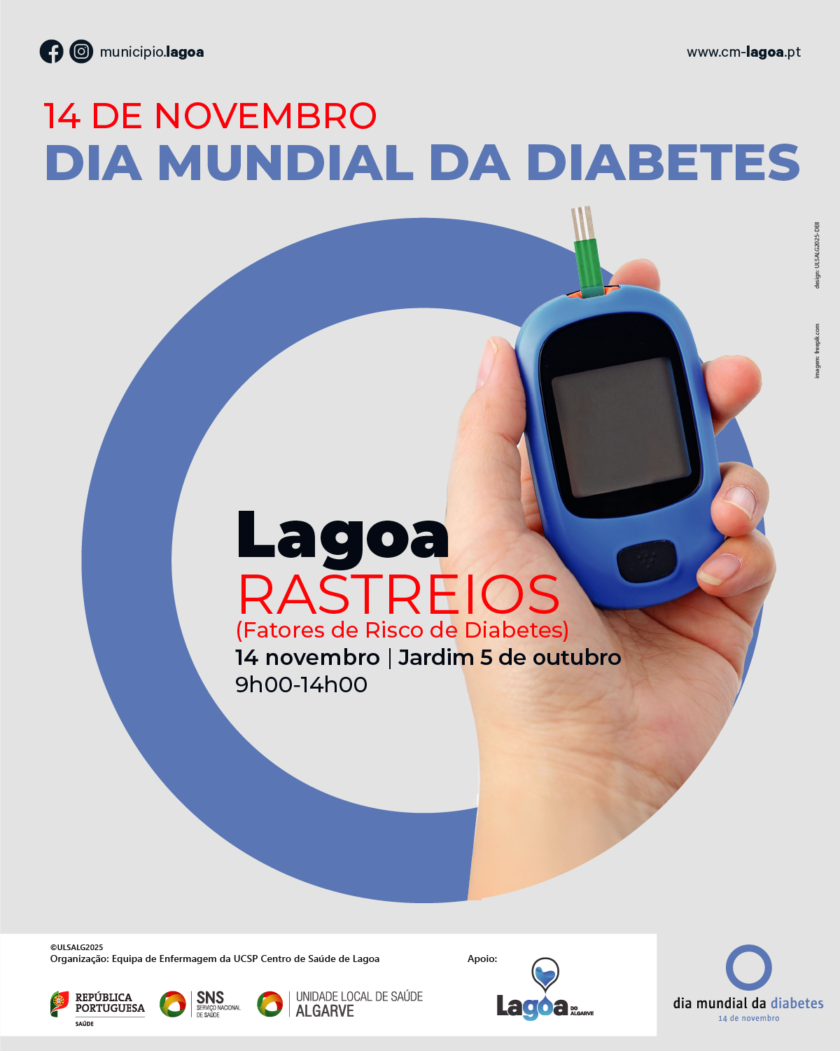A Unidade Local de Saúde do Algarve, através da equipa de enfermagem da UCSP – Centro de Saúde de Lagoa, em parceria com o Município de Lagoa, irá promover um rastreio gratuito dos fatores de risco da Diabetes, aberto a toda a população.