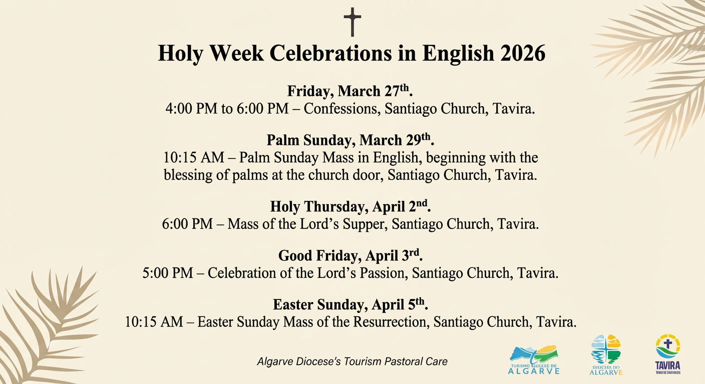 Programa da Semana Santa 2026 em inglês na igreja de Santiago, Tavira