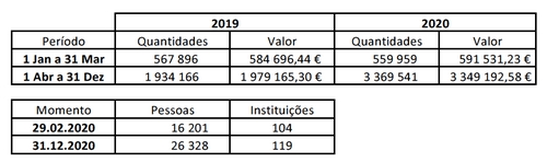 No mesmo período de 2020 foram entregues 559.959 unidades de produtos alimentares no valor de 591.531,23€. Ou seja, uma operação idêntica.