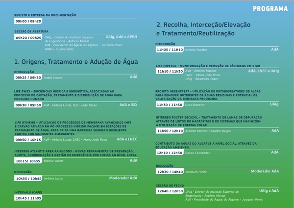 A Águas do Algarve inicia este Congresso Internacional, durante toda a manhã do dia 09, com o WORKSHOP ÁGUAS DO ALGARVE – PROJETOS DE I&D+INOVAÇÃO NO CICLO URBANO DA ÁGUA - https://www.aguasdoalgarve.pt/content/increase2019