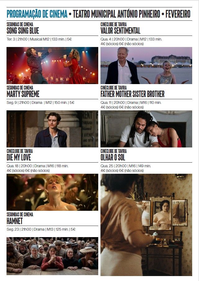 A agenda integra propostas do Cineclube de Tavira, o ciclo Segundas de Cinema, reforçando o compromisso do Teatro com uma programação cultural diversificada e acessível. Os bilhetes têm o valor de €4,00 (sócios) e €6,00 (não sócios) nas sessões do Cineclube de Tavira, sendo de €5,00 para as Segundas de Cinema.